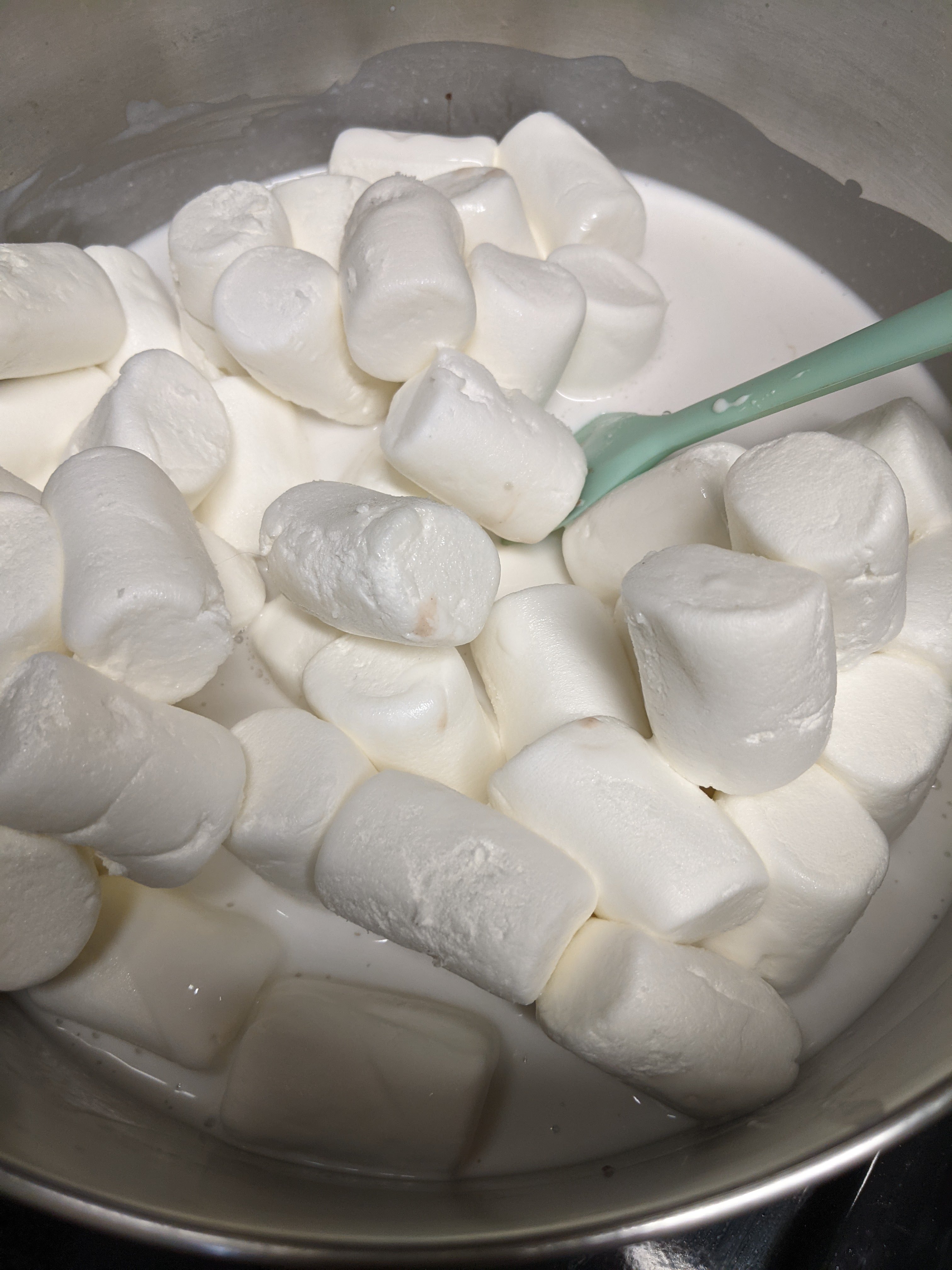 - In a large pot, add 1 can coconut milk. On medium heat, heat up the coconut milk and then add the marshmallows. Stir the marshmallows until they are completely melted.