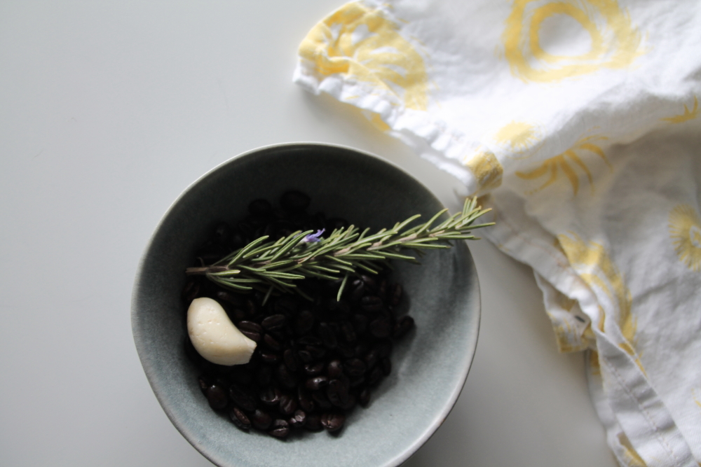 Place about 1/4 cup of ground coffee and 1-2 cups of water in a sauce pan. To this add, 1-2 garlic cloves an 1 stick of rosemary.