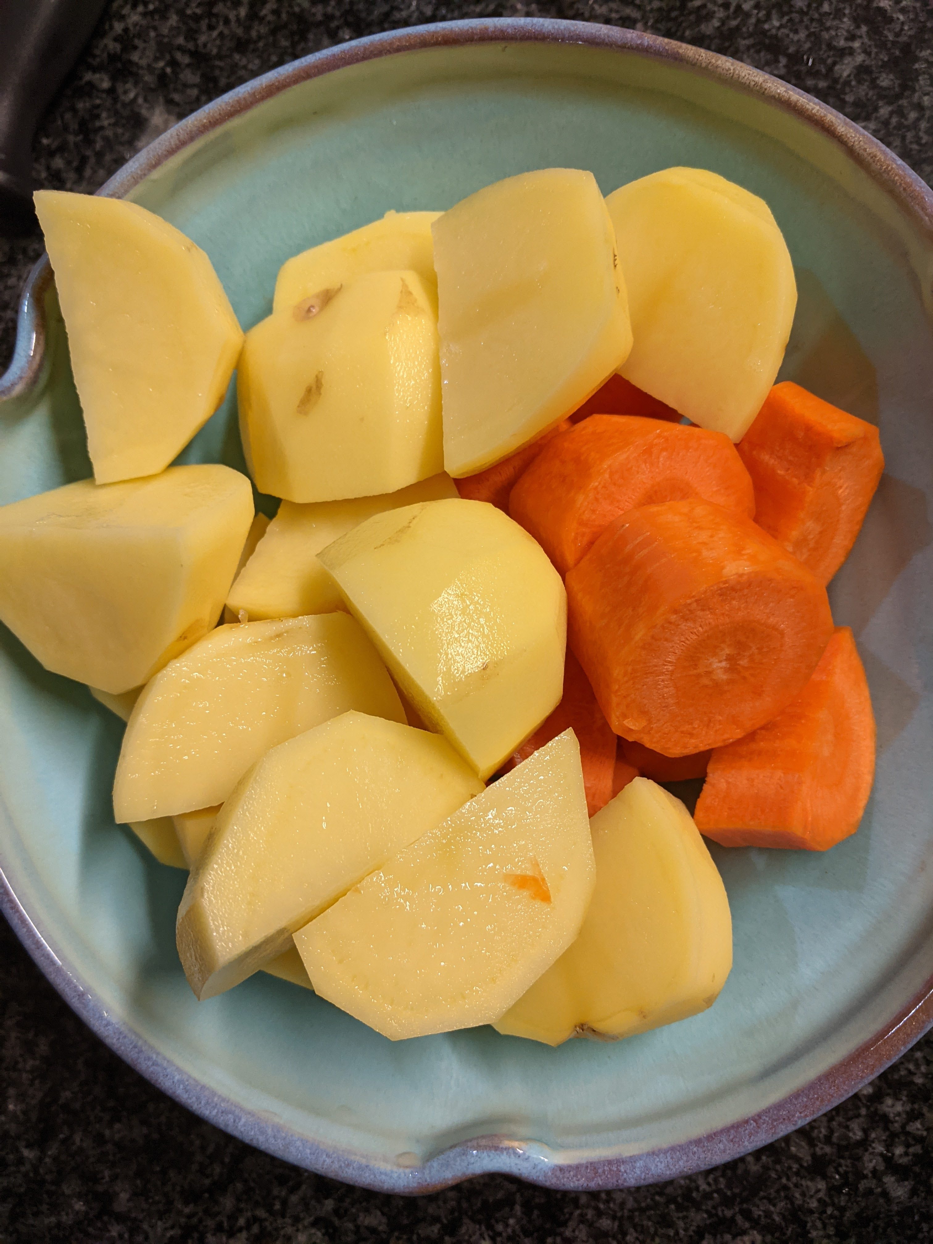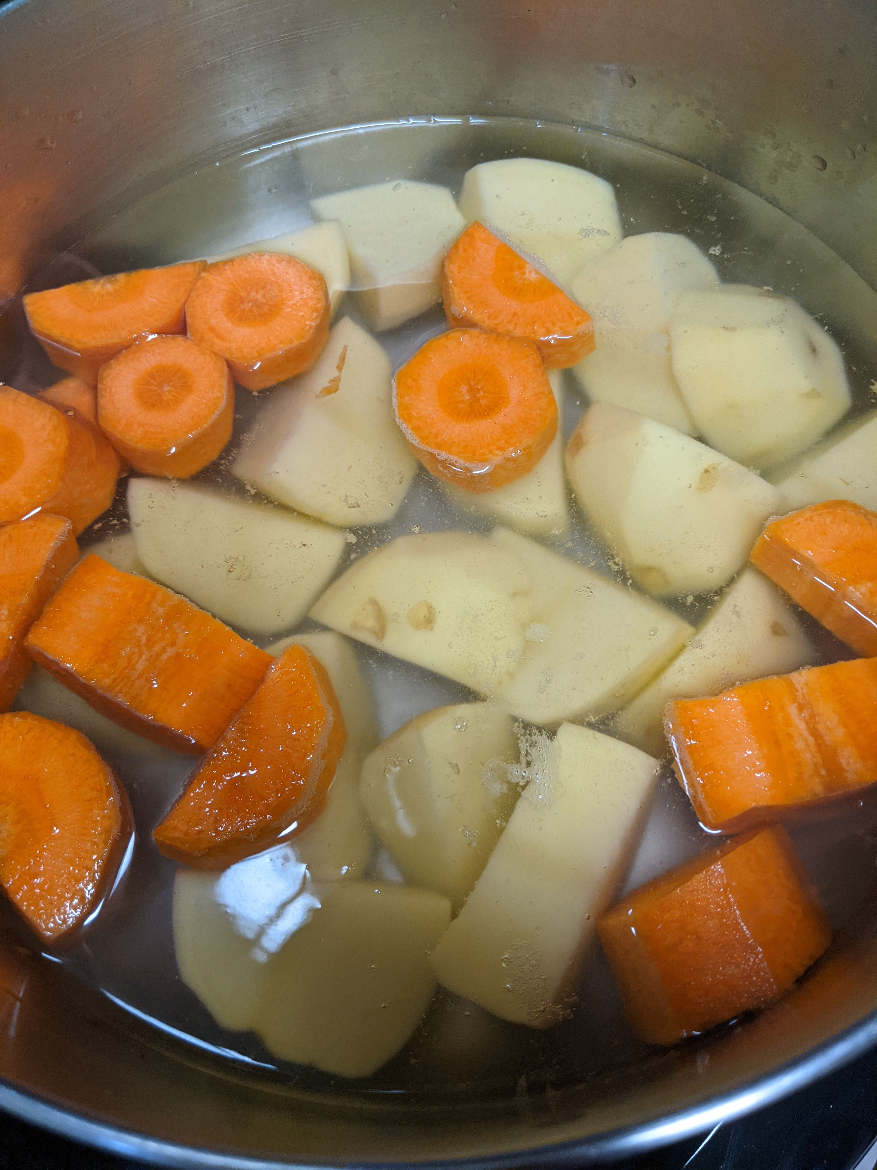 - Chop and cook potatoes and carrots in a pot of water until they are fork tender.