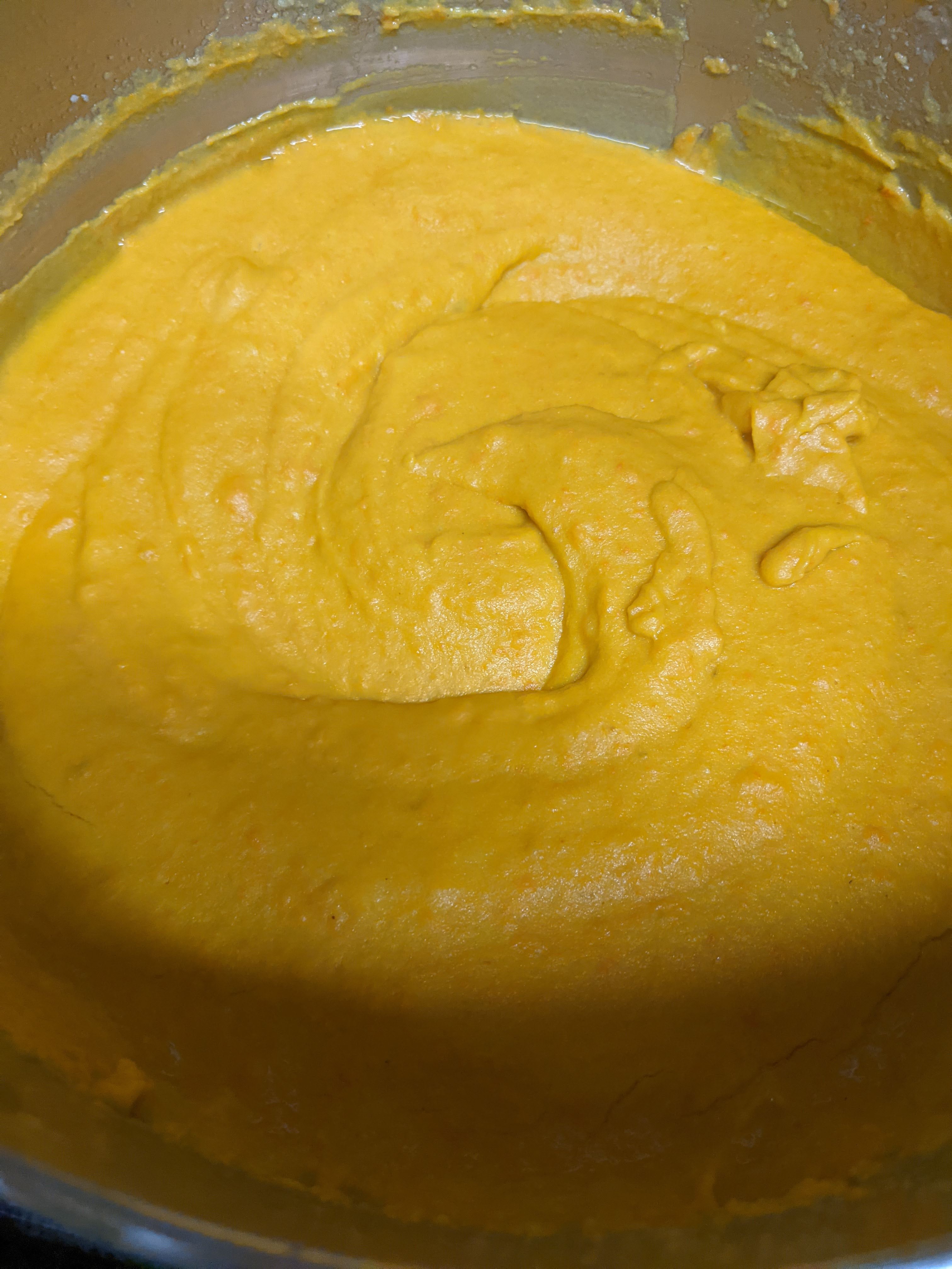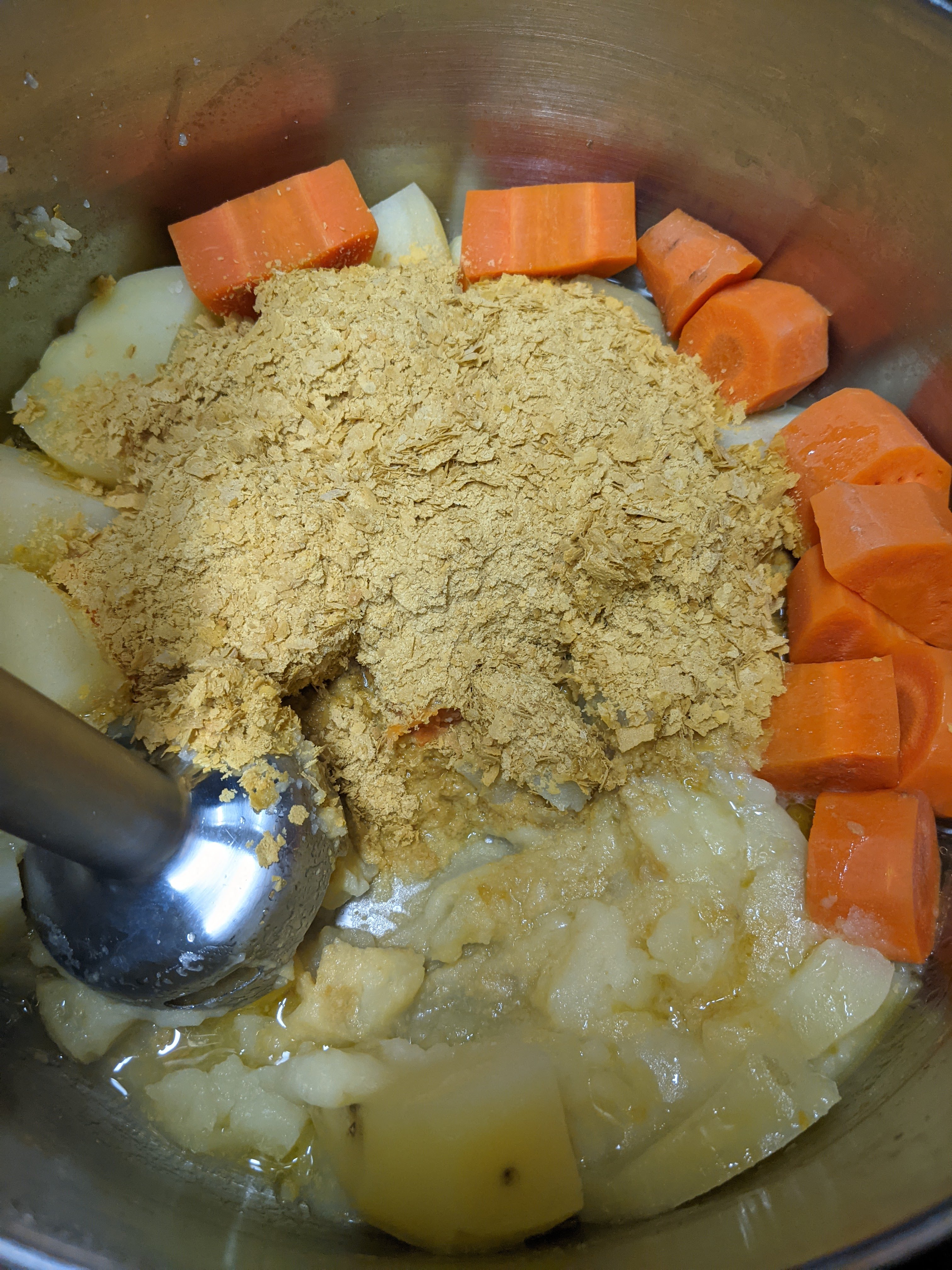 - In the blender (or pot if you are using an immersion blender), blend the carrots, potatoes, 1/2 cup water, 1/4 cup olive oil, 1 cup nutritional yeast, 2 cloves if garlic and 1 tablespoon of olive oil. Blend until it is nice and creamy. Season with salt and pepper.