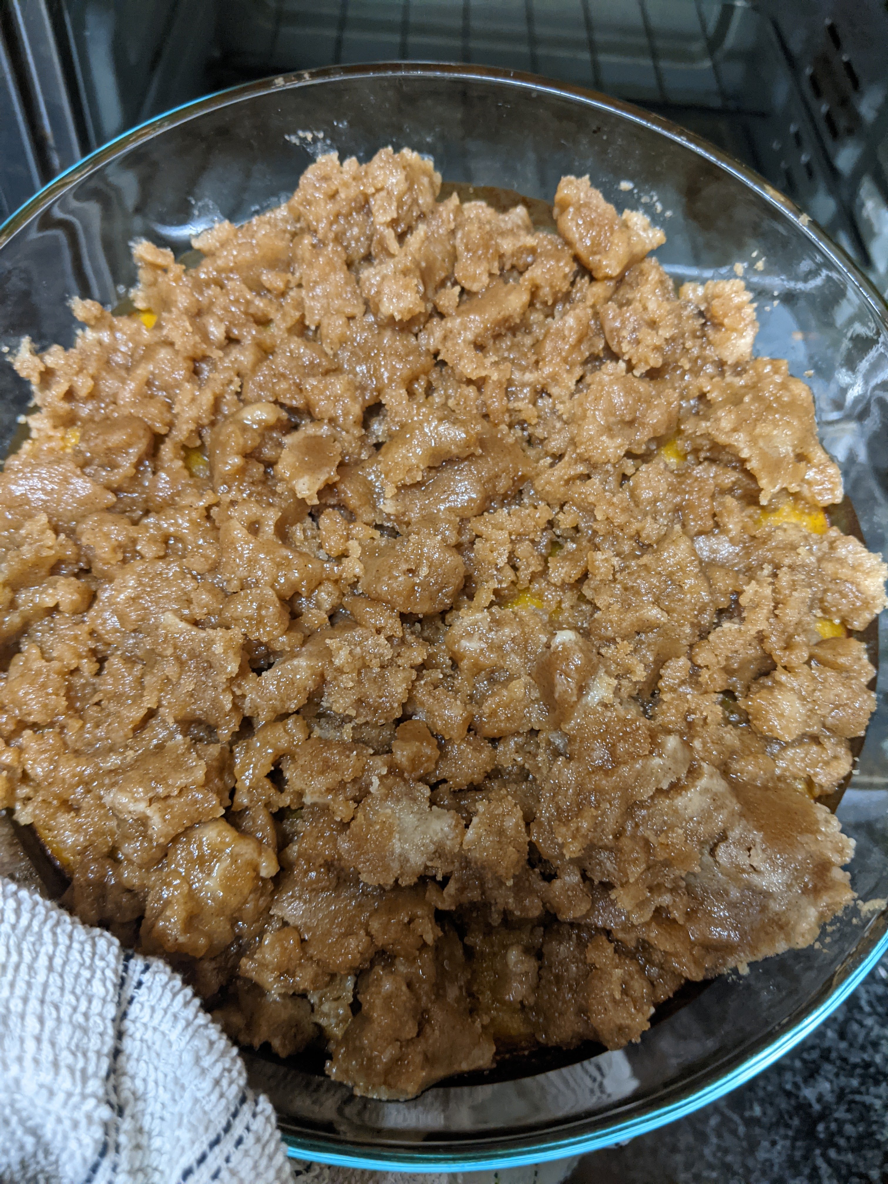 - After the pumpkin filling has baked for 30 minutes, add the crumble topping. Make sure to leave large chunks.