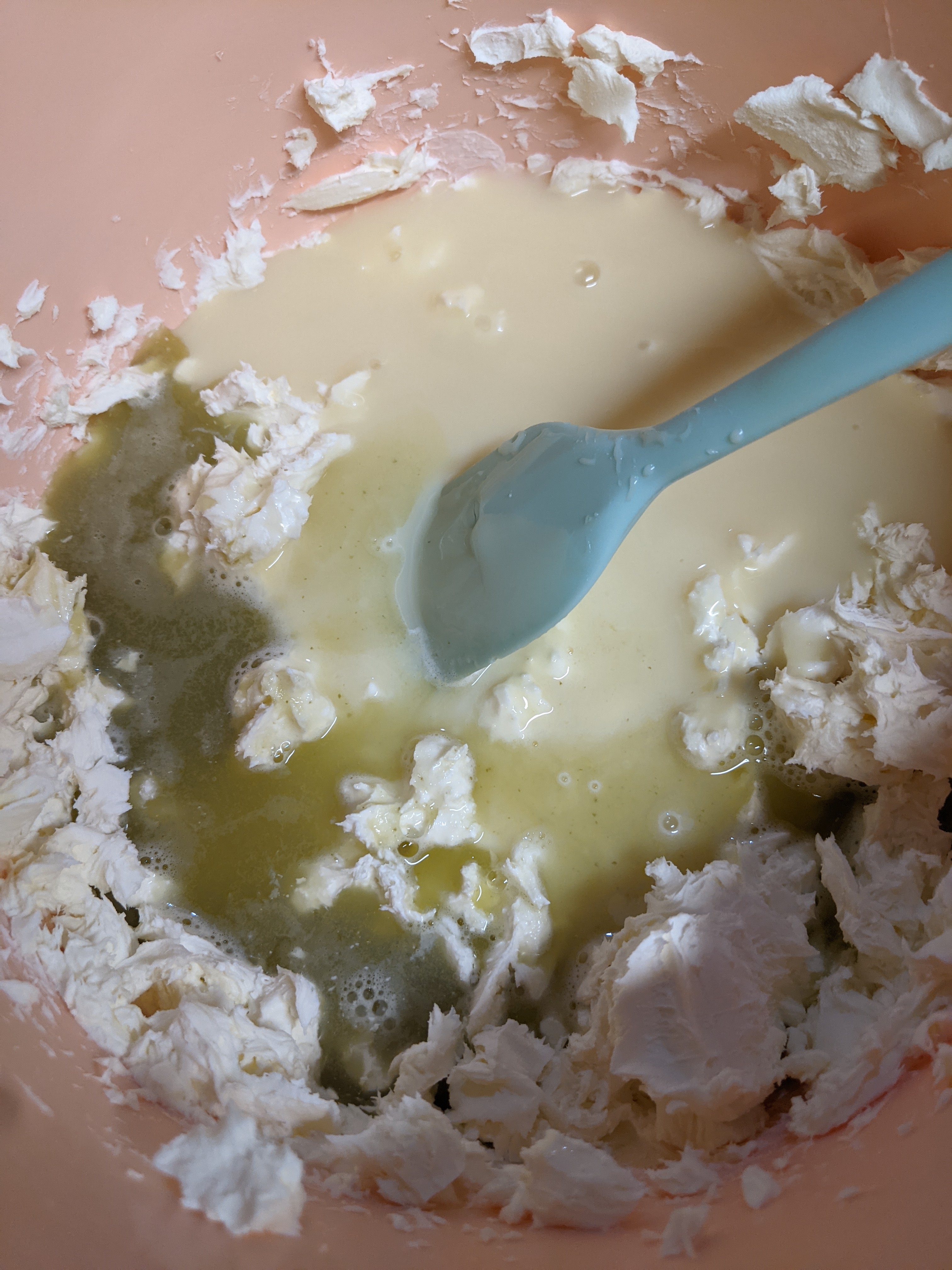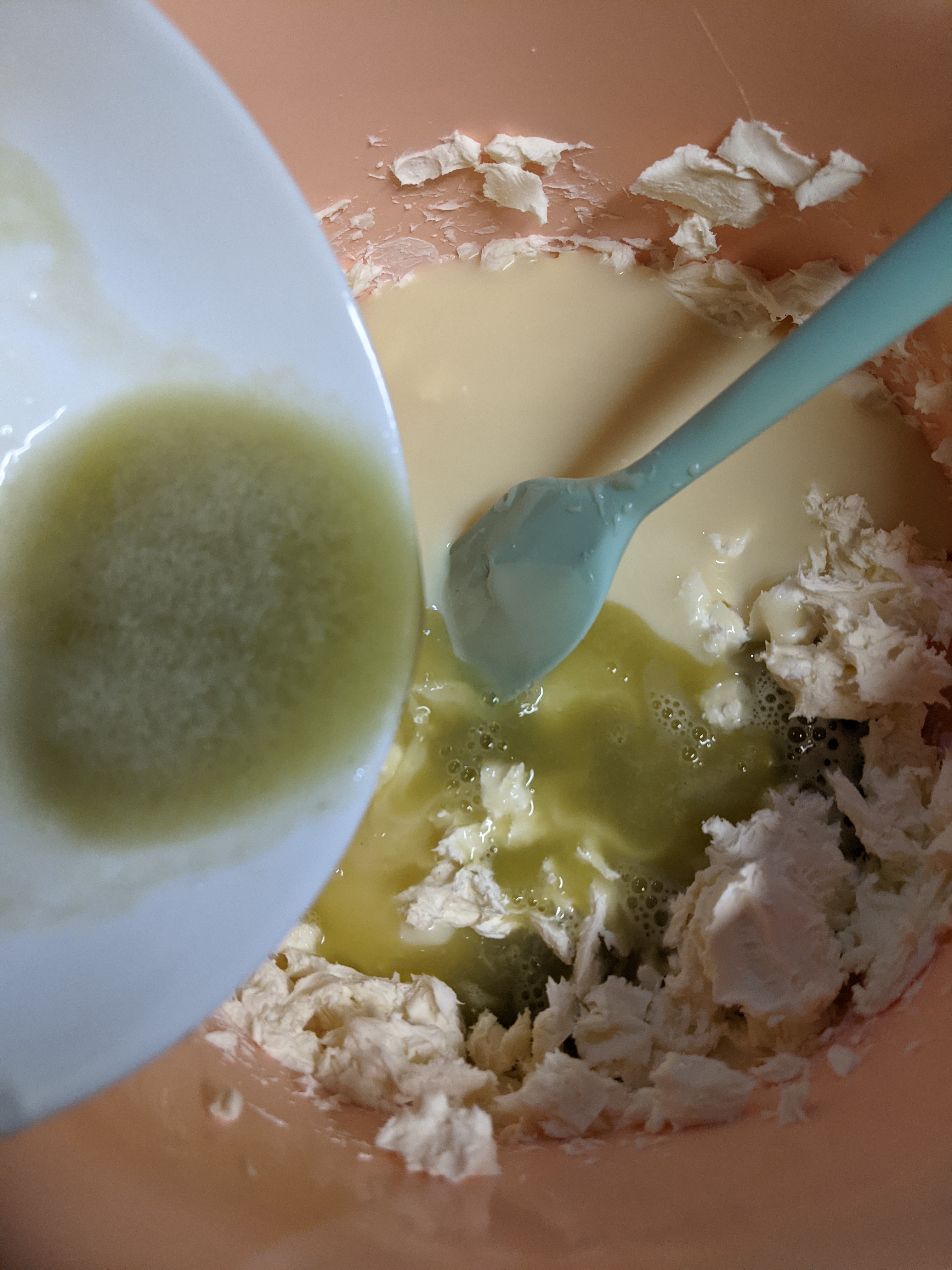 - In a mixing bowl, beat 8 ounces of cream cheese until smooth. Slowly add one can of condensed milk to the cream cheese. Add the blended pickle and mix well.