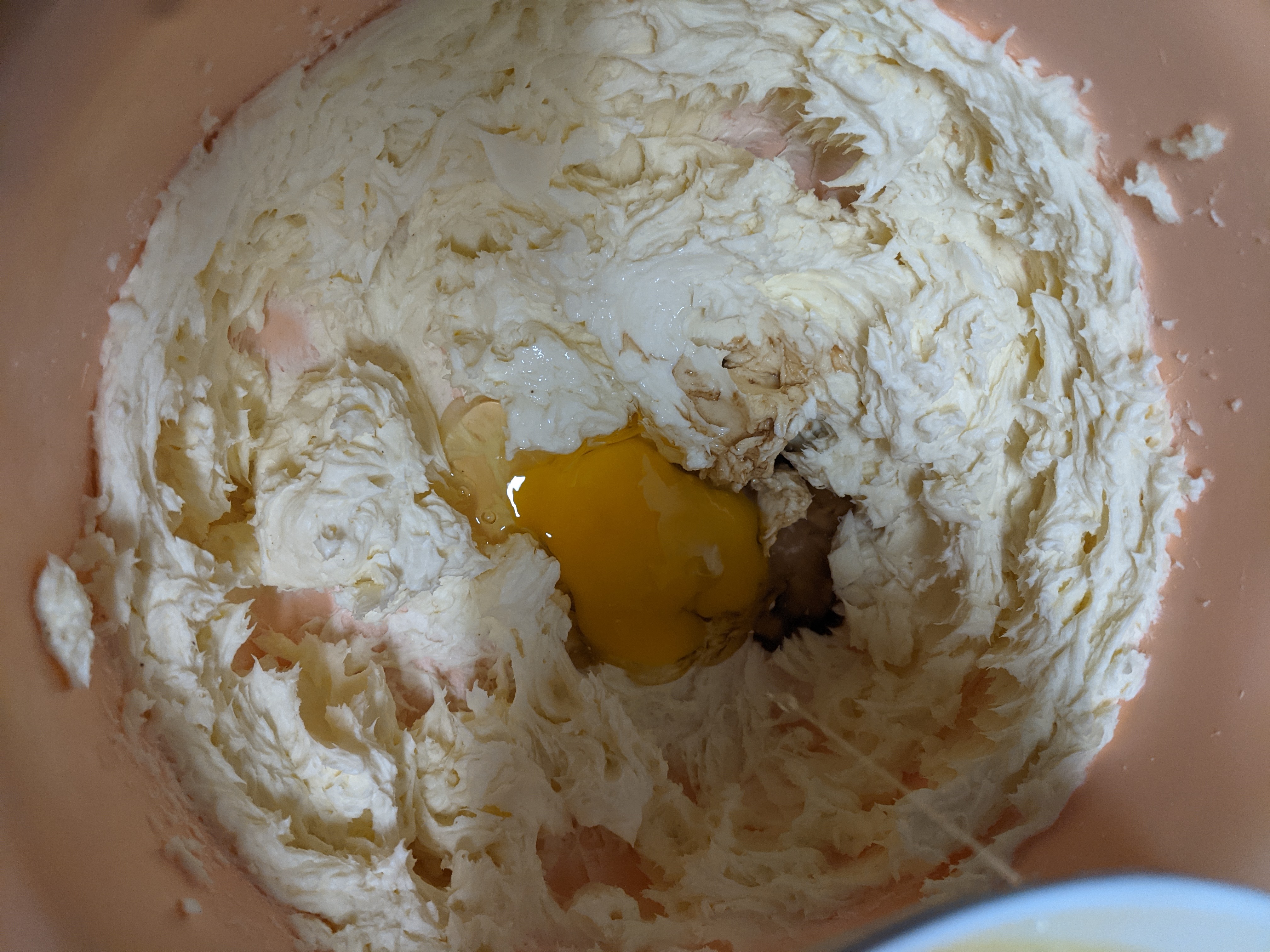 In a mixing bowl, add 16 ounce of cream cheese. Beat the cream cheese with a hand mixer. Slowly incorporate 1/2 cup granulated sugar, 1/2 teaspoon salt and the 1 1/2 teaspoon vanilla extract. When these ingredients are mixed well, add one egg at a time and continue to mix together. Set aside.