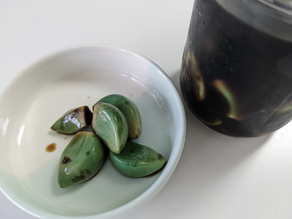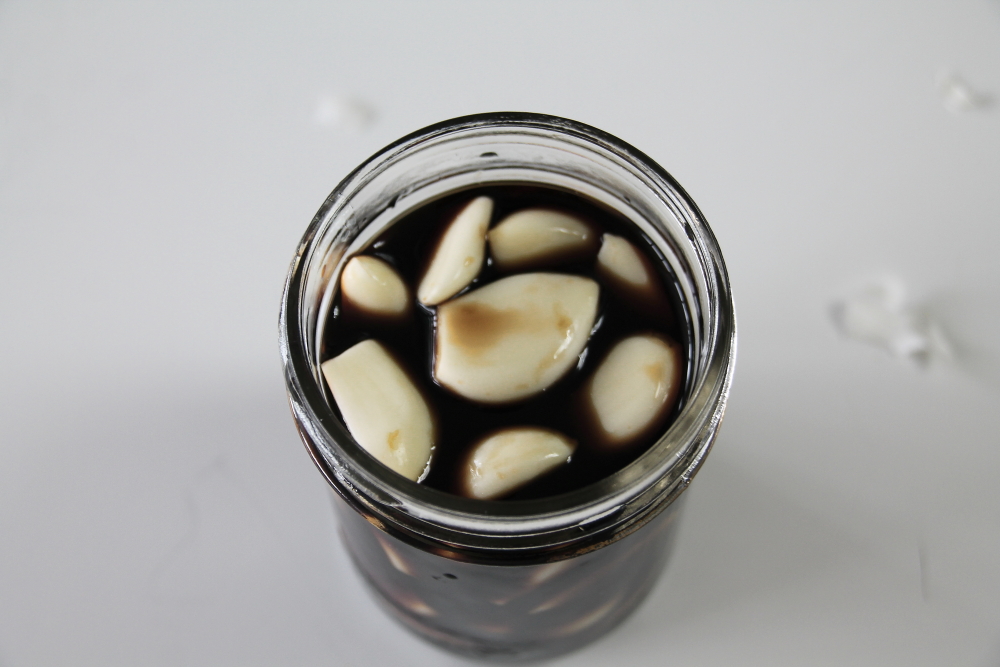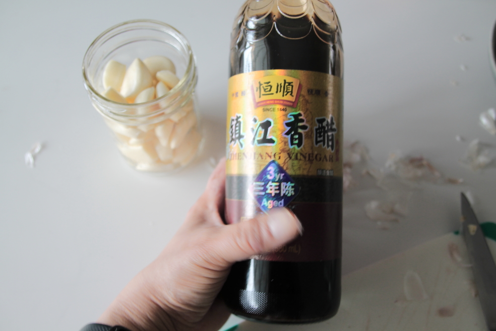 Cover the garlic with black vinegar. You can also try other vinegars if you can’t find black vinegar. The vinegar and garlic will react and turn the garlic green.