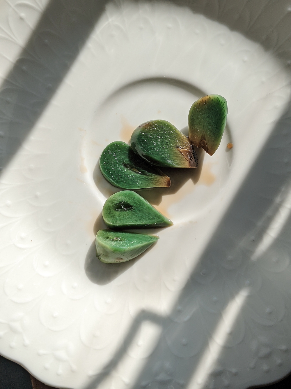 Once the garlic is fully green, you can use the garlic in many ways. Traditionally it is just eaten on the side with dumplings or other dishes during New Year, but I have also used it on Charcuterie boards, or chopped up in dishes. It tastes good cooked or raw. Enjoy.