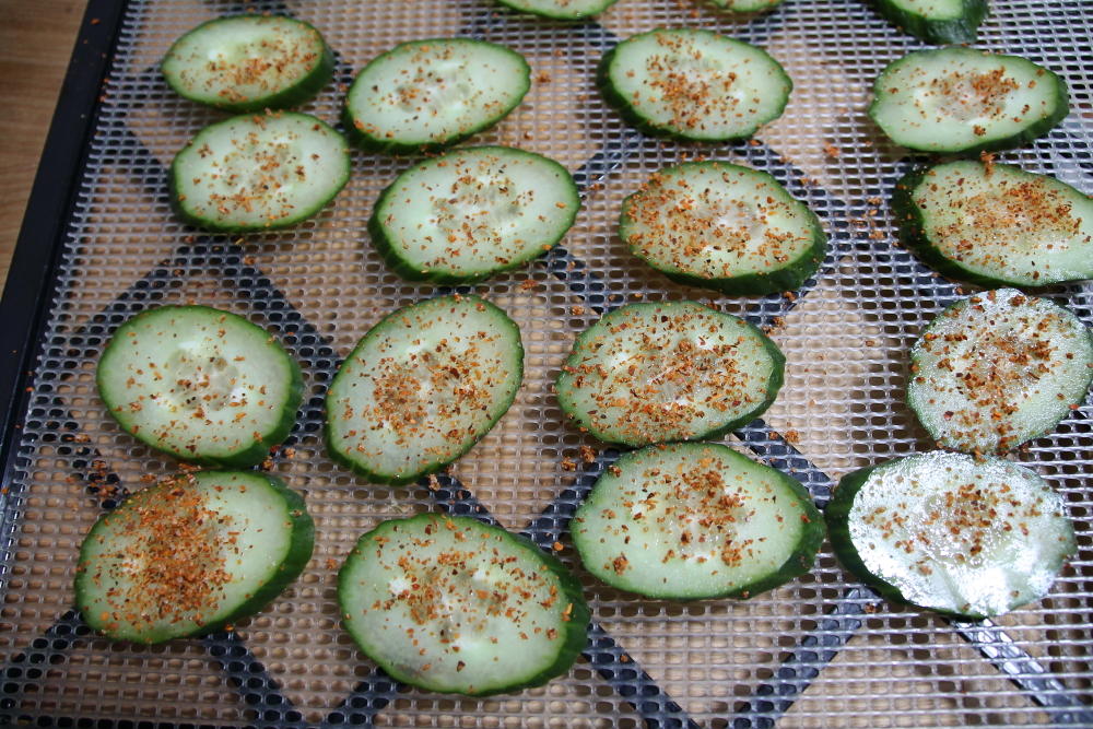 Lay the cucumber slices on a dehydrating sheet. Sprinkle with some tajin on both sides and dehydrate for 4-5 hours or until completely dry and crispy. I put my dehydrator on the vegetable setting about 125 degrees F.