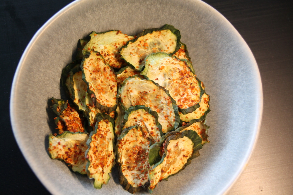 The trick to make these chips is to not cut them too thin. The cucumber is mostly water and they will shrink. That was my mistake the first time. They were papery thin but very brittle. I cut them about 1 cm thick and they turned out better. The chips were crispy and held their shape.