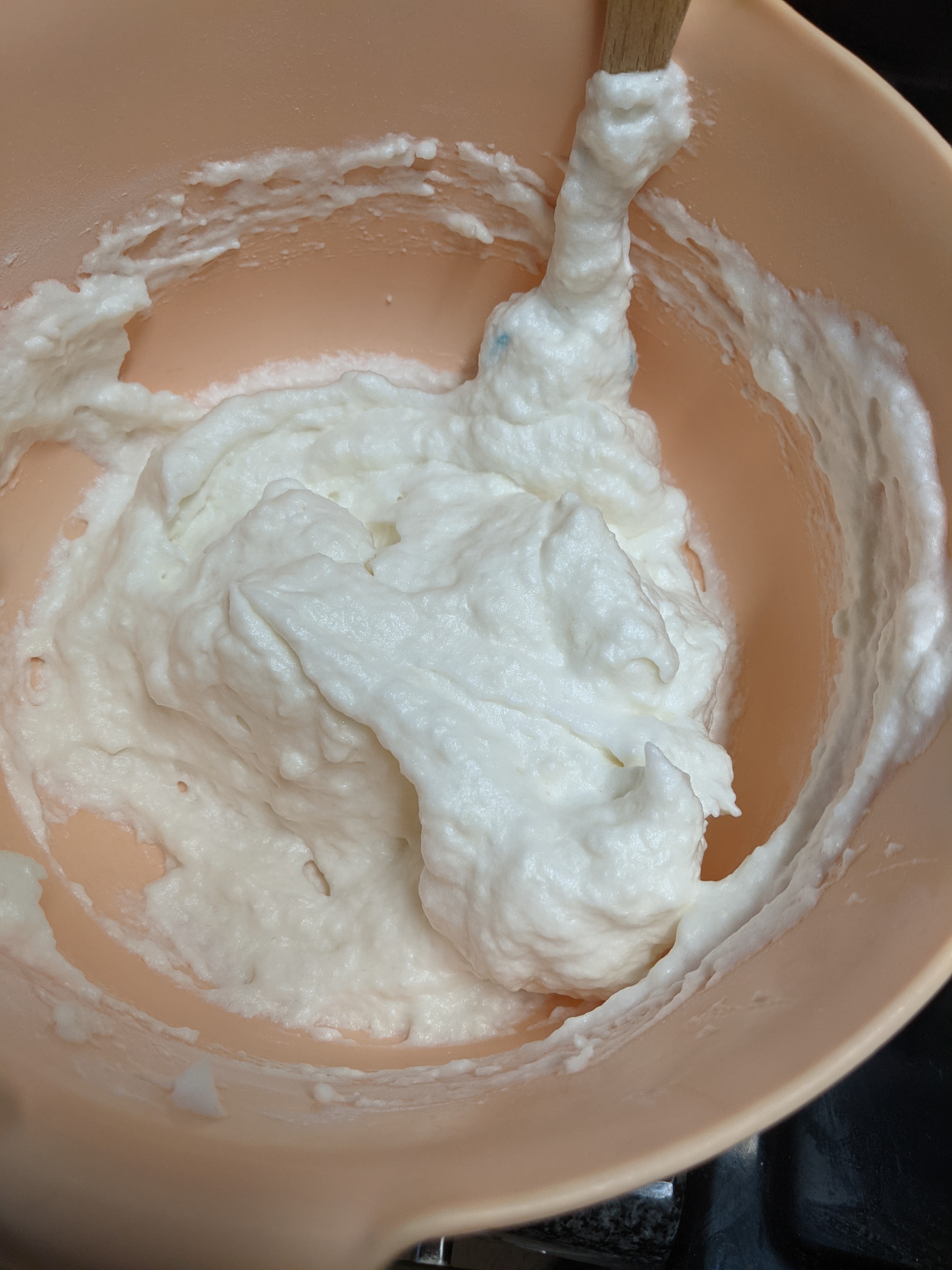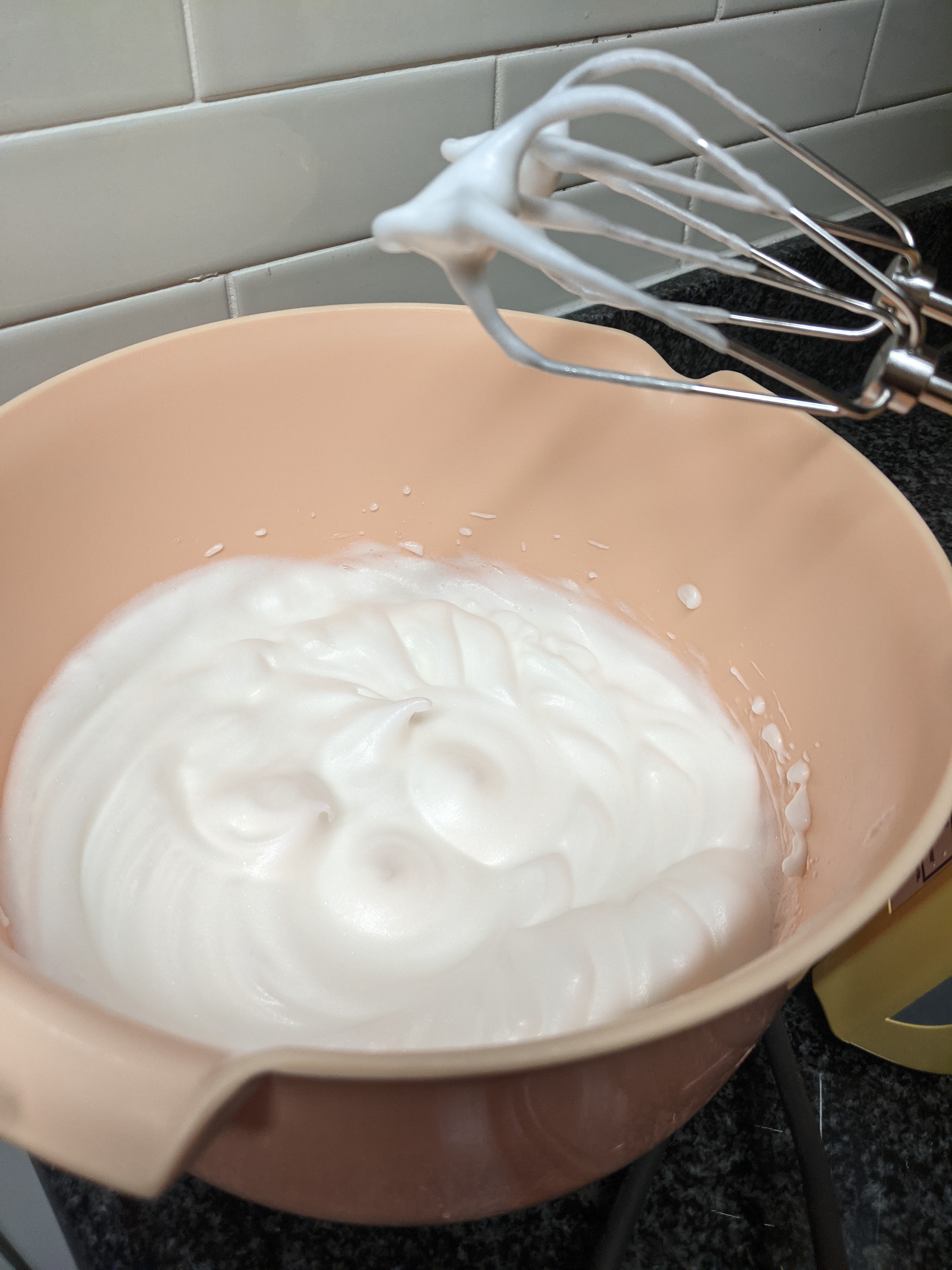 Start by beating 4 egg whites (room temperature) with 1/4 teaspoon cream of tartar, 3 tablespoons of granulated sugar and vanilla extract. Beat until it is fluffy and has stiff peaks.
