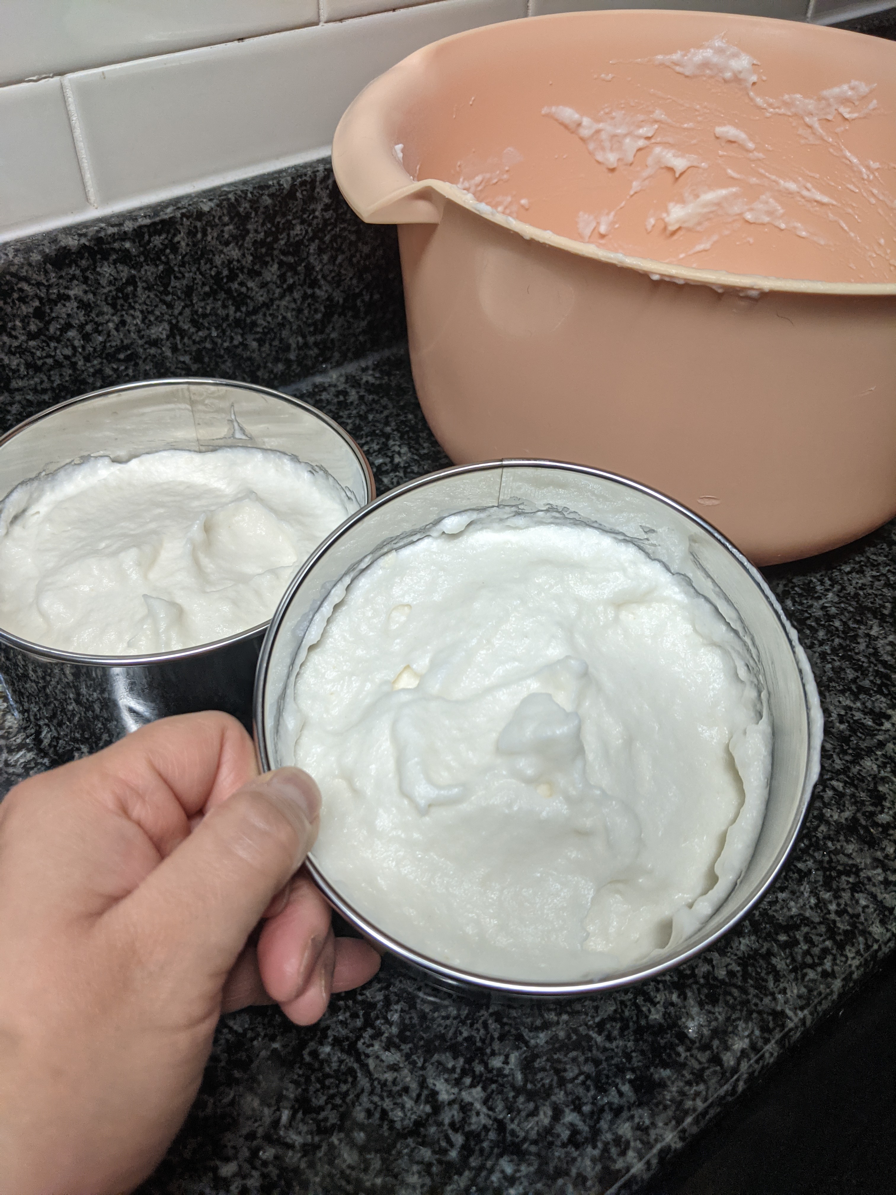 Preheat an oven to 325 degrees C. Fill the round pans with batter. You do not need to grease the pan because you want the batter to stick while baking.