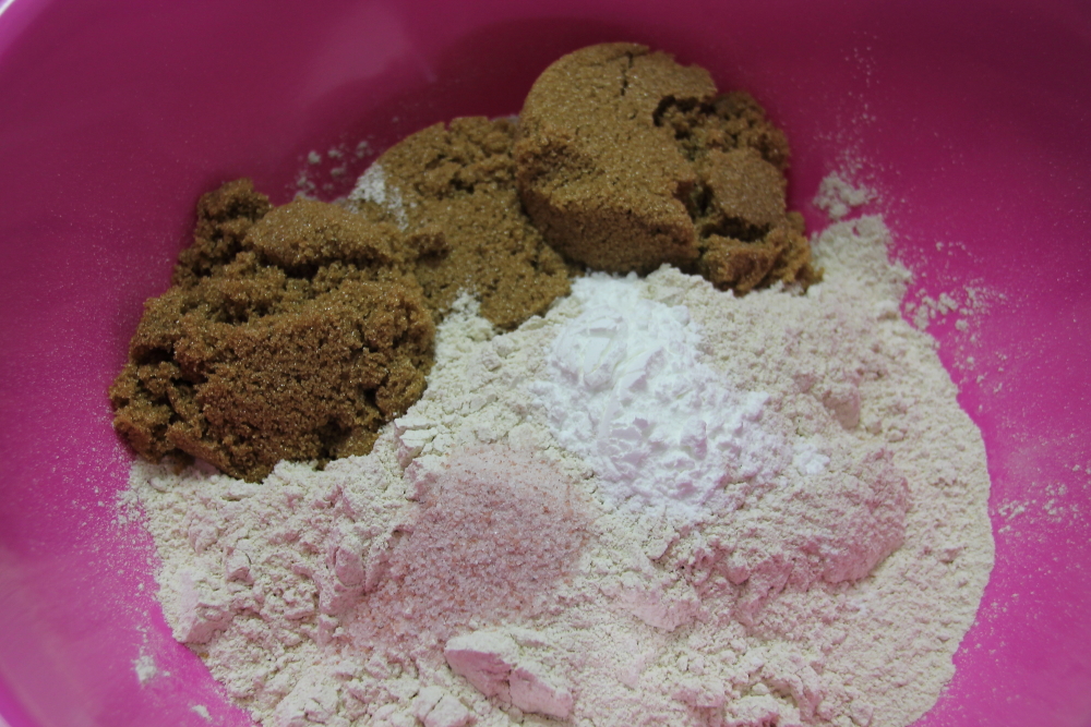 In another bowl, mix together flour, brown sugar, baking soda, and salt. Add in the butter and mix together until crumbles form. I think I should have added more flour to my mixture.