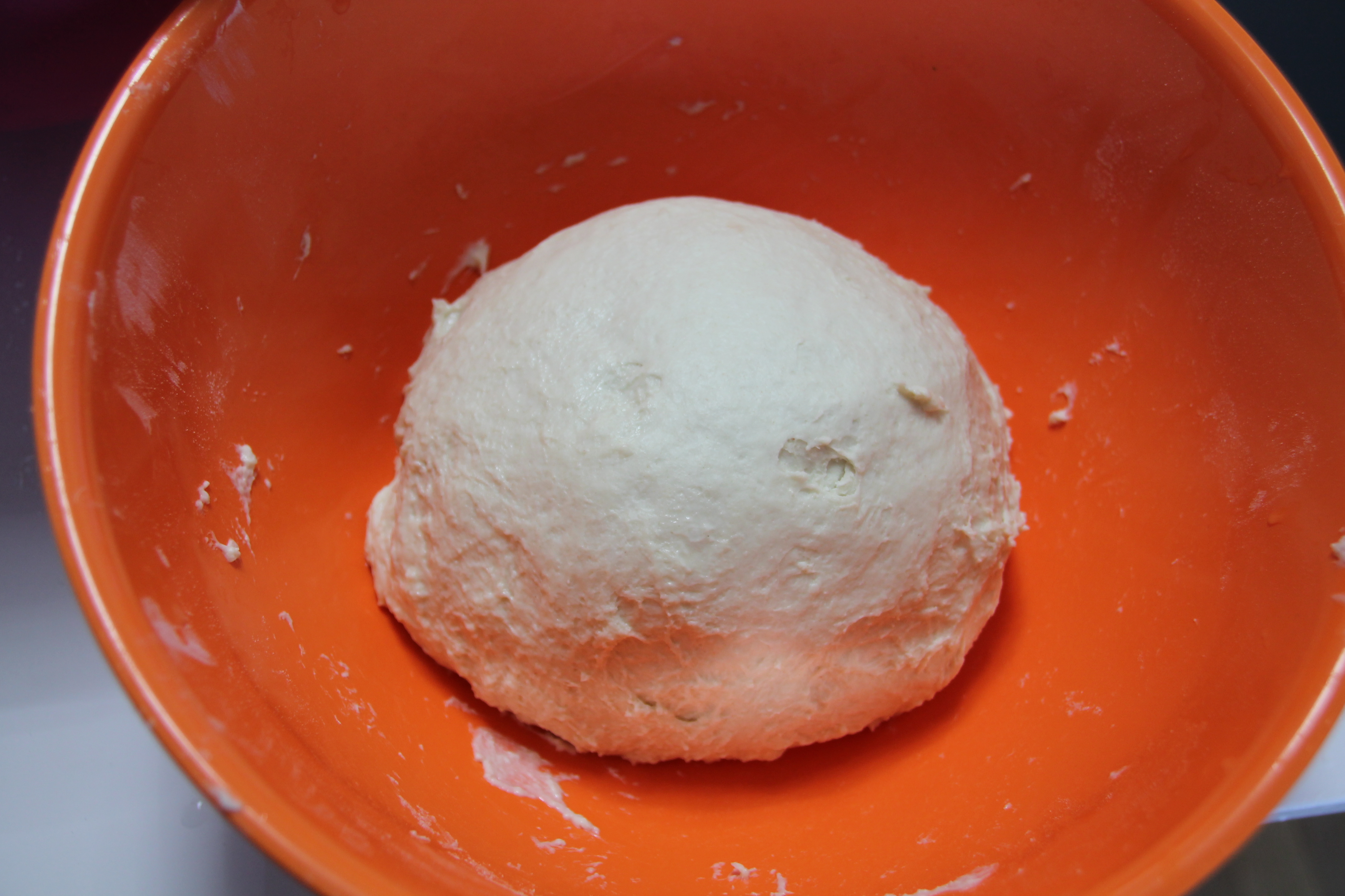 Knead for a couple of minutes and then cover with a layer of oil and plastic wrap or cloth. Allow to sit in a warm place for about 30 minutes until the dough rises. I usually use the oven with the light on or at the lowest warm setting.