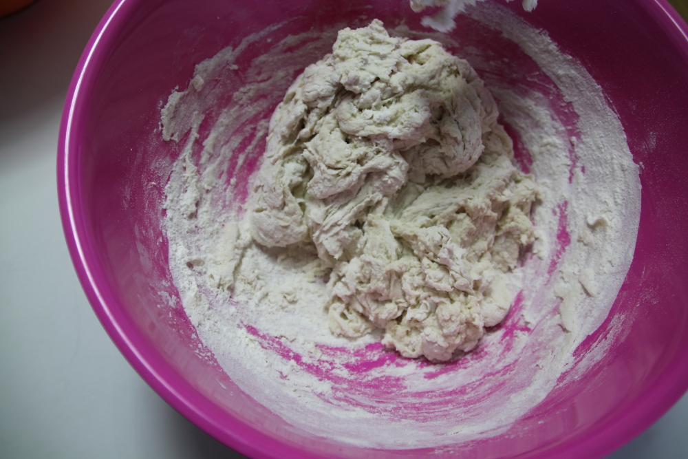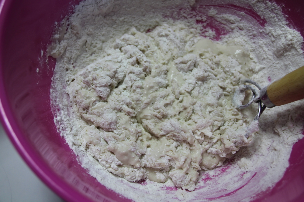 Pour the yeast water into the flour. Mix well, add flour until the dough starts pulling away from the bowl. You don’t want a super firm ball but you also don’t want the dough to be too wet. You can use a stand mixer with a dough attachment if you wish.