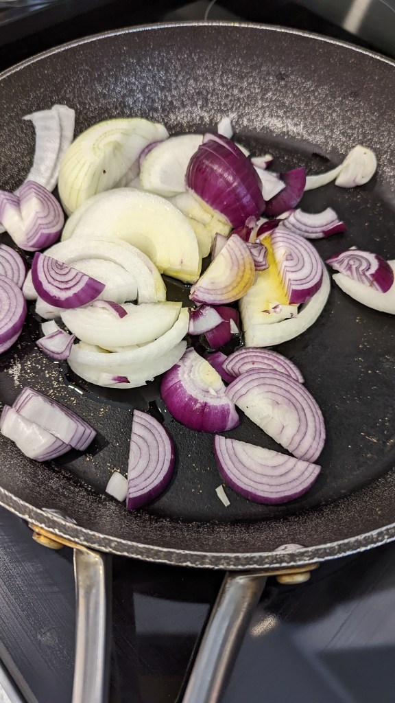 2. Prepare the ingredients. Begin by cutting up the onions. Add 1/8 cup of butter into a frying pan. Turn oven to medium. Add the onion and cook slowly until the onions are nicely caramelized. This can take a while as you do not want to burn the onions.