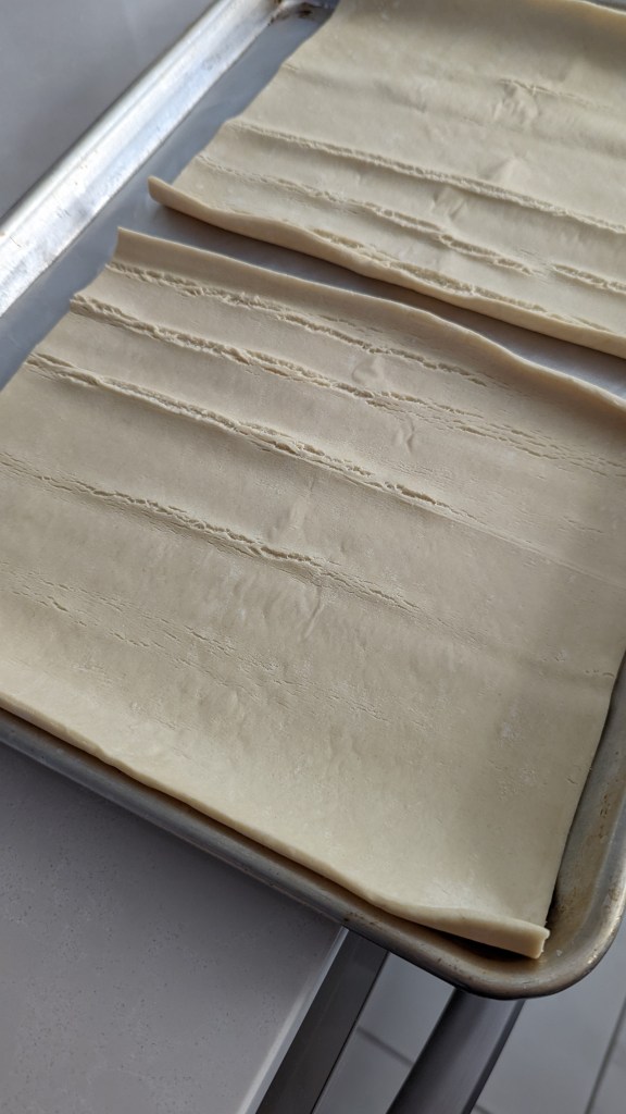1. Defrost the prepackaged puff pastry according to instructions on the package. Lay it out flat on a baking tray.