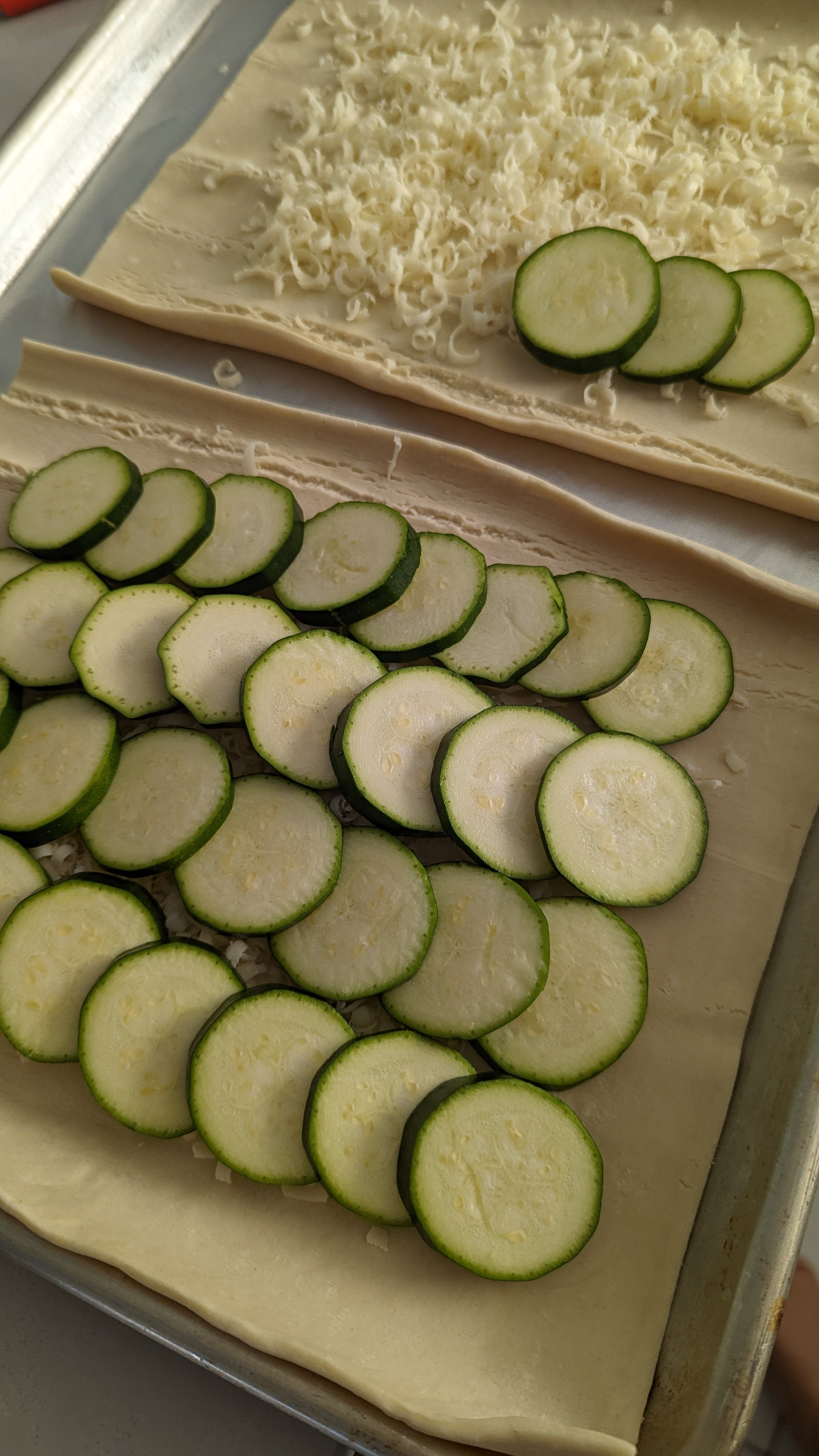 4. Cover the puff pastry with grated cheese. Add zucchini slices on top.