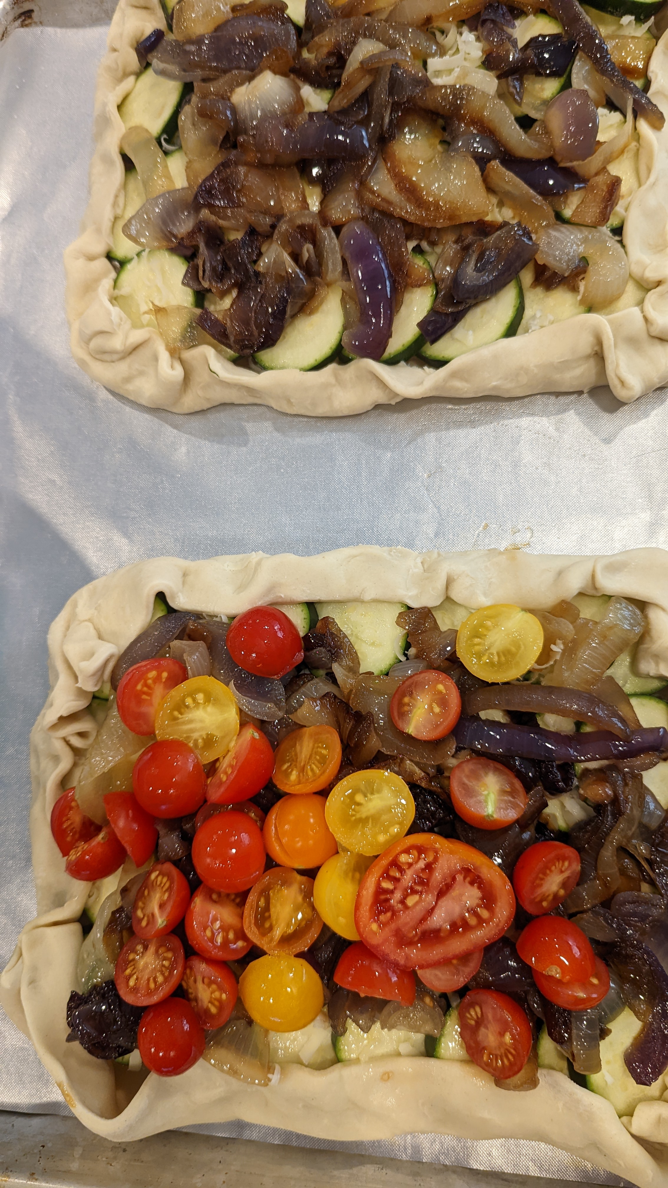 Cover the puff pastry with grated cheese. Add zucchini slices on top. The next layer would be the onions. Add a nice thick layer to the zucchinis. Finally add all the tomatoes.