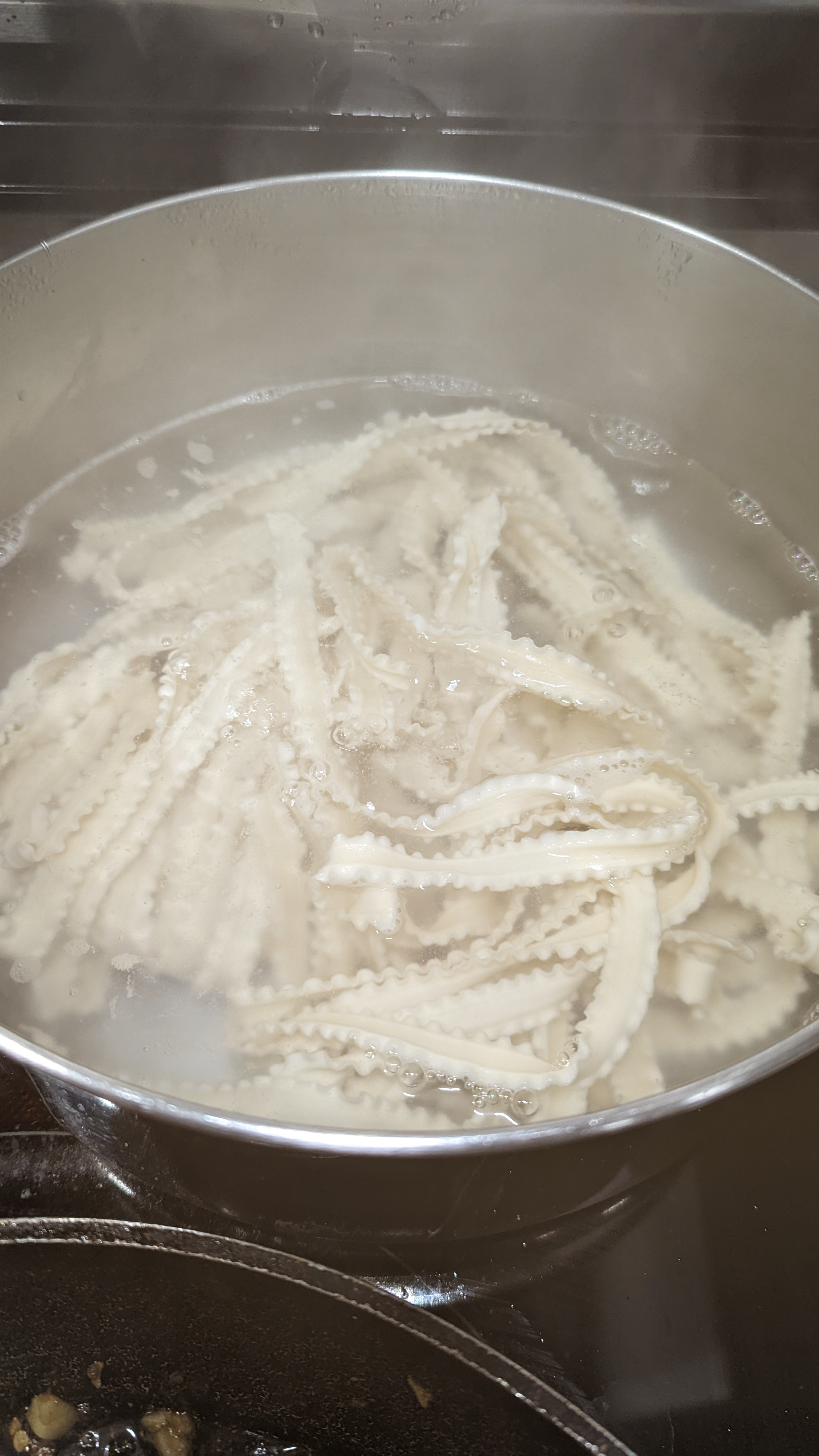 While the lamb is cooking, cook 1/2 pounds of noodles. I love using dried pulled/cut noodles.