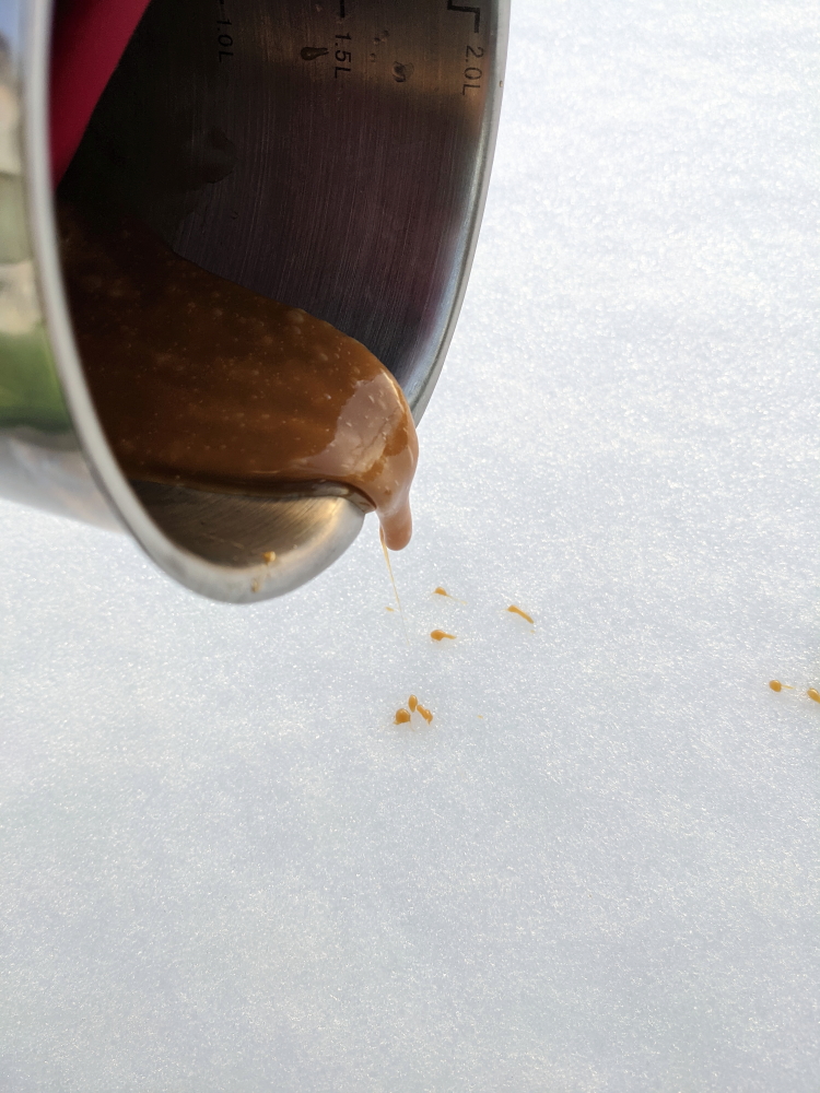I did store extra in the fridge, but they turn a little tacky as the snow left them slightly damp. They tasted like caramel brittle and they stuck to my teeth a bit and didn’t snap as much as I wanted them too. But this definitely was fun and I want to try other recipes.