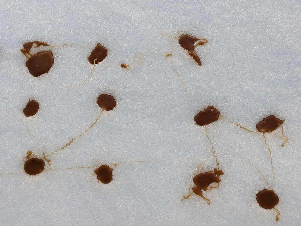 Now comes the tricky part as you need to work fast before the candy hardens. Pour the candy onto the snow in little blobs.