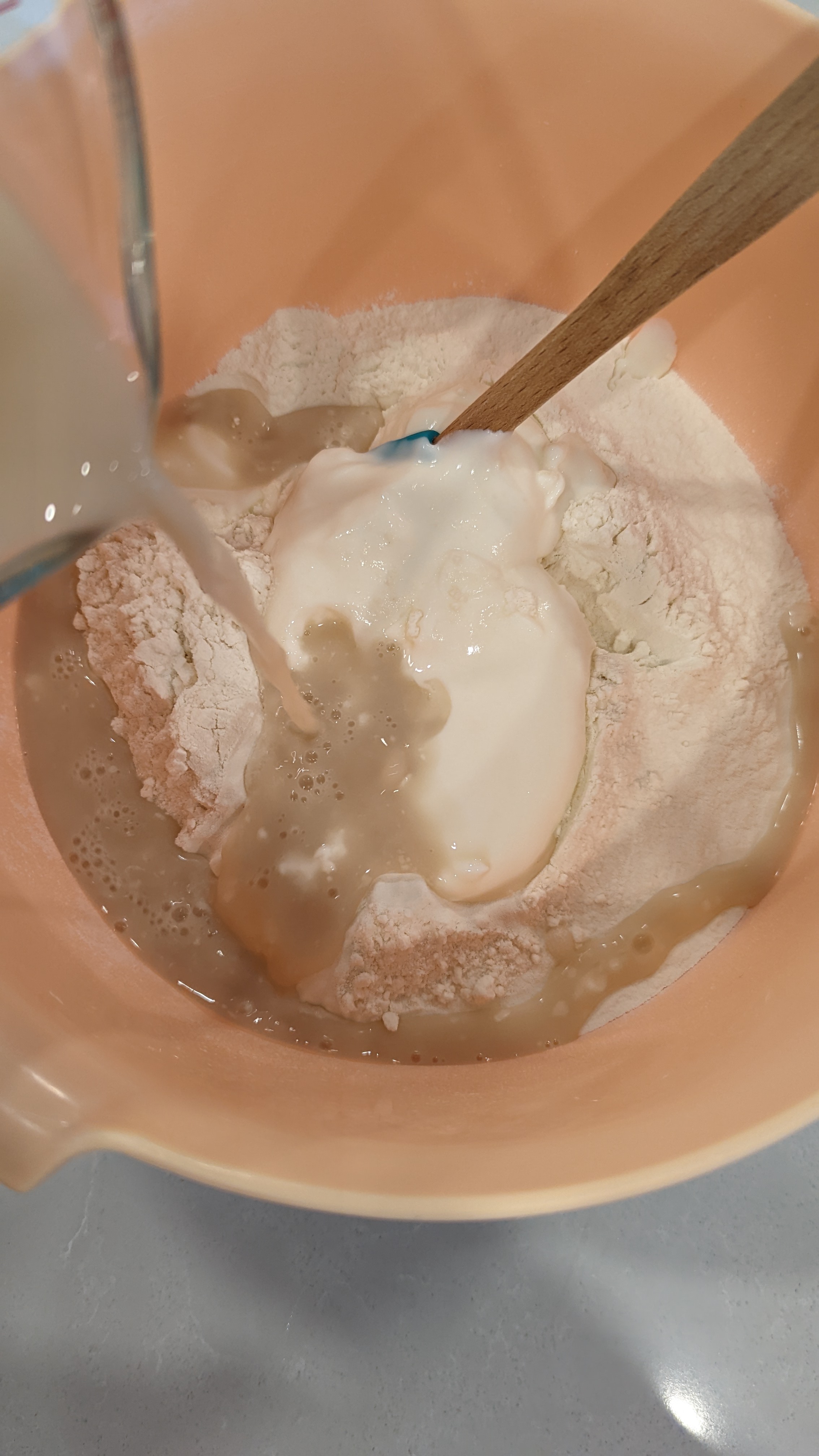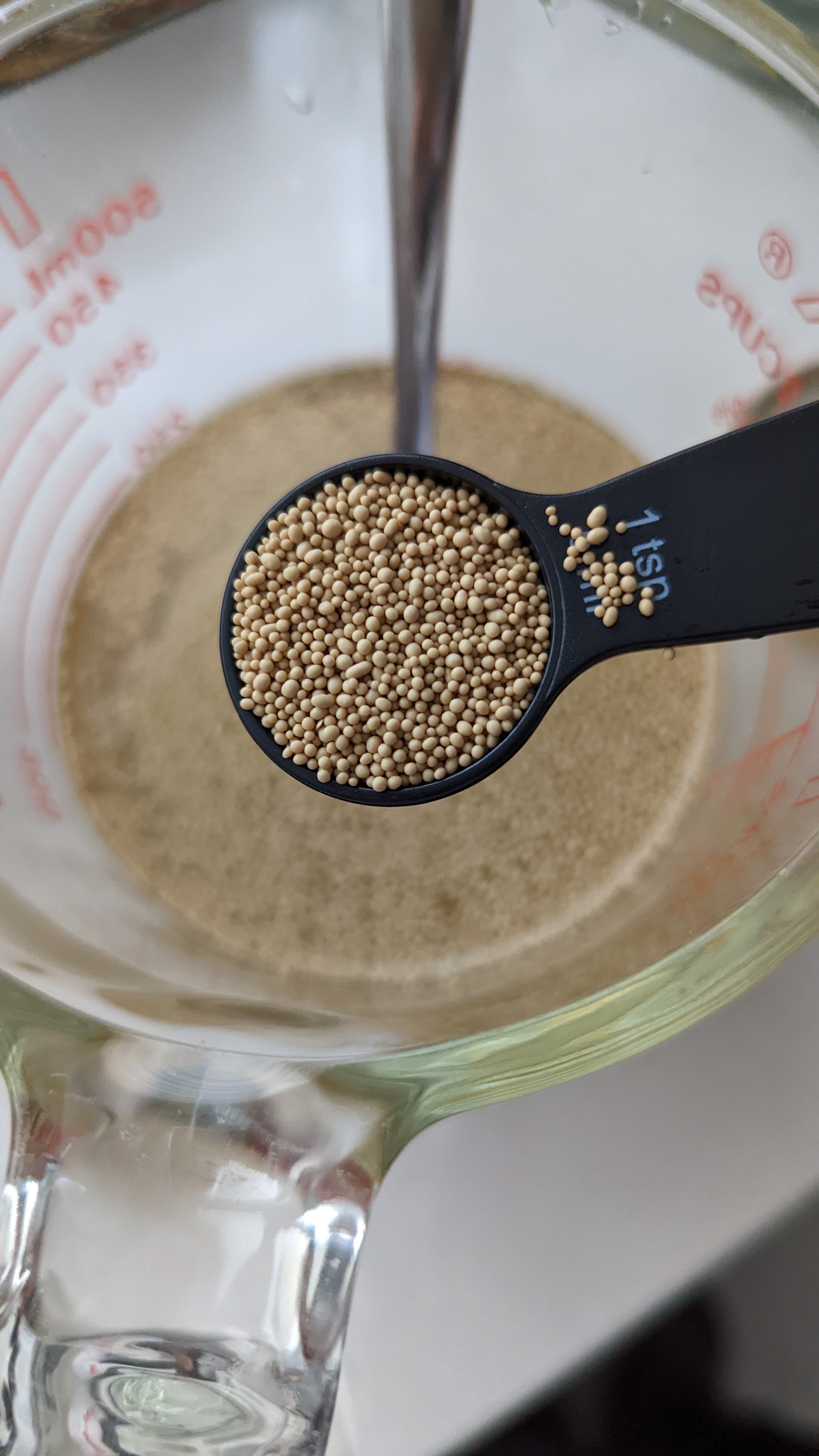 - When the yeast is activated, combine it with 1/3 cup plain yogurt. Mix to combine.