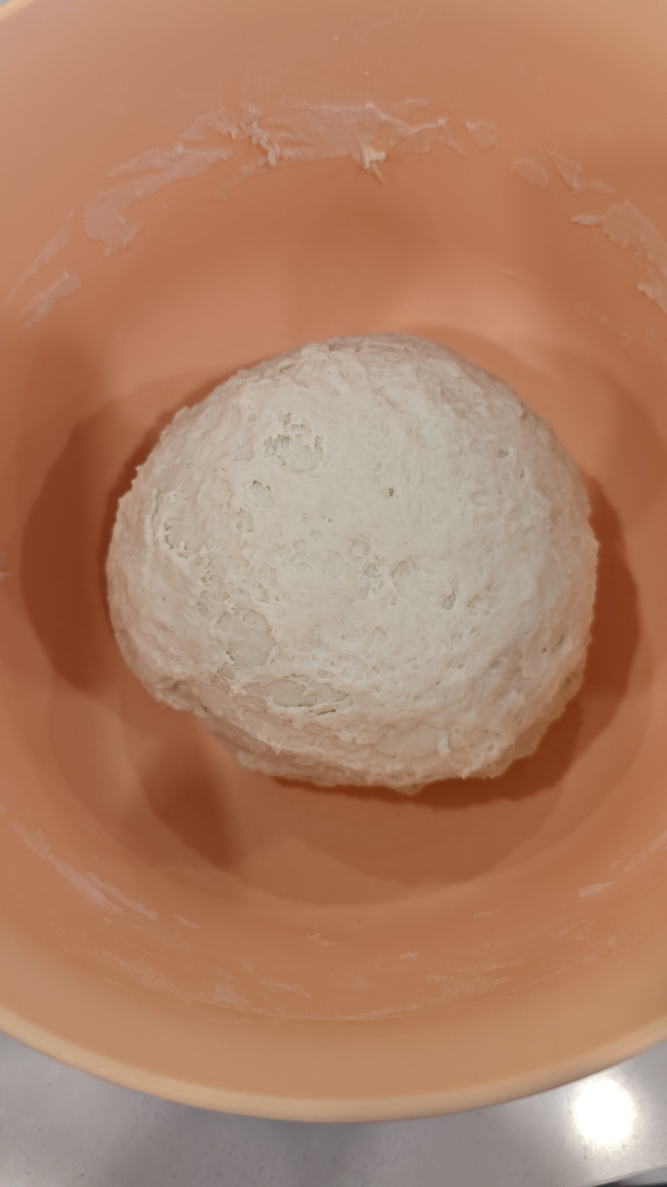 - Form the dough into a ball and place it in an oiled bowl and cover with a damp dish towel or plastic wrap. Leave the dough to rise for about an hour or longer on cooler days. You want the dough to double in size.
