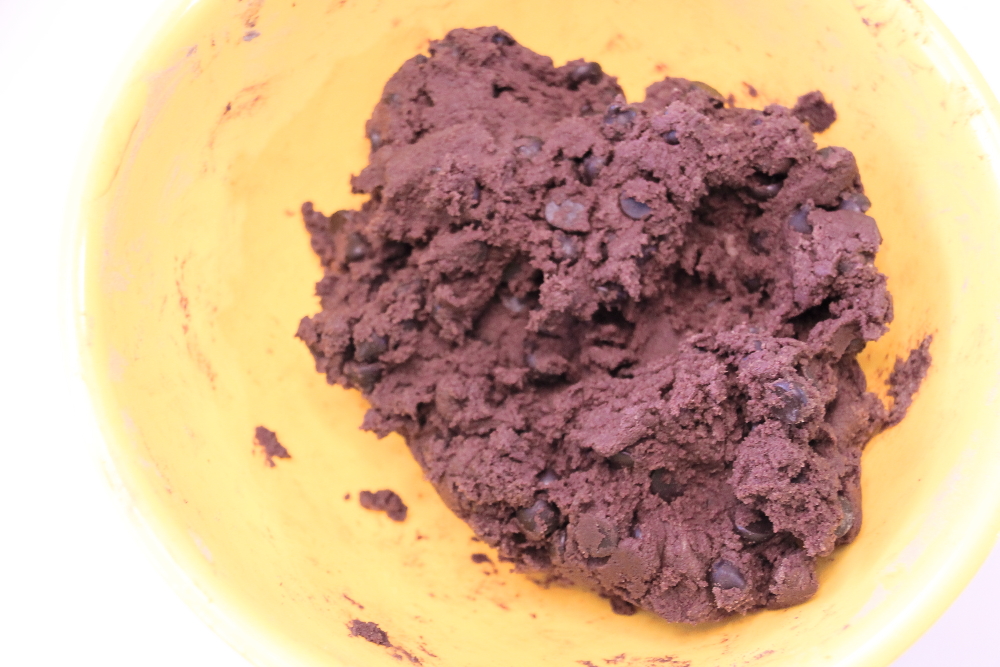 In a bowl, cream together the butter and sugar and brown sugar. To this add the egg and vanilla extract. In a separate bowl, mix together the dry ingredients: flour, cocoa powder, baking soda and salt.