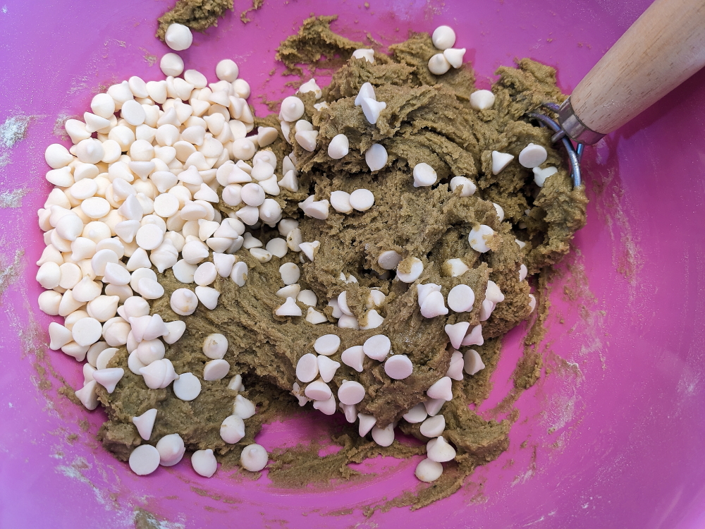 Add the creamed butter to the matcha flour and then add white chocolate chips.