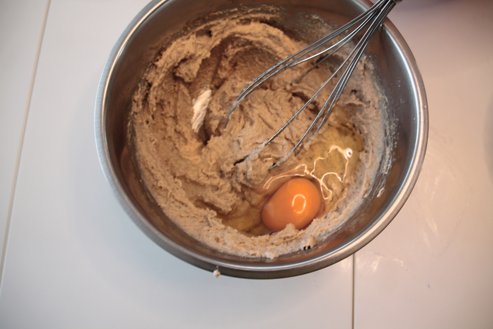 In a bowl cream together the browned butter and sugar. To this add the egg and vanilla extract.