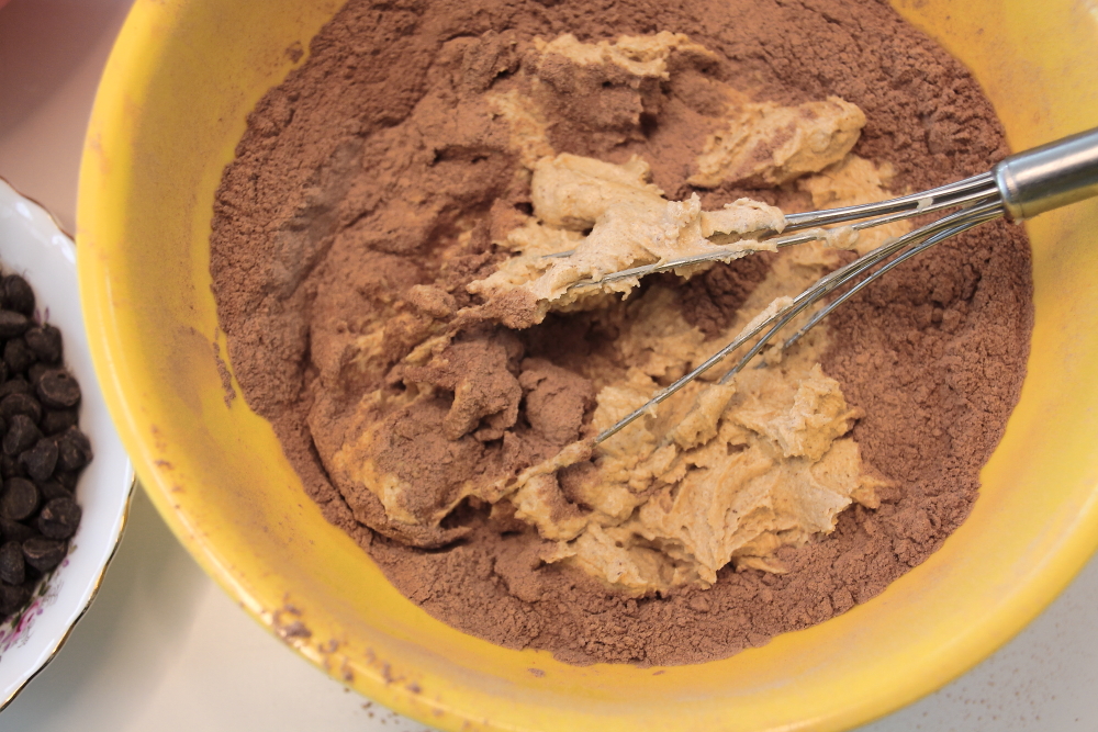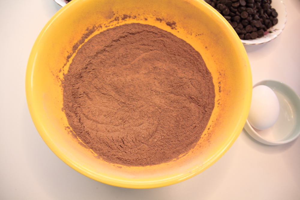 In a bowl, cream together the butter and sugar and brown sugar. To this add the egg and vanilla extract. In a separate bowl, mix together the dry ingredients: flour, cocoa powder, baking soda and salt.