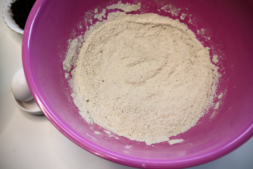 In a separate bowl, mix together the flour, matcha powder, baking soda and salt.