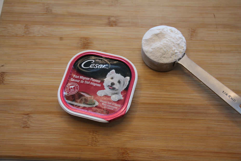All you need is your dog’s favorite wet food and some whole wheat or all purpose flour.