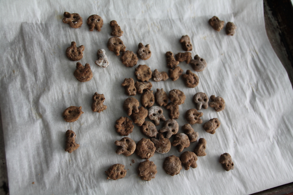 Bake at 350 Degrees for about 30 minutes. Then leave them in the oven to cool and they will be nice and crispy. Also leave your fan on or window open. It wasn’t the nicest smelling cookies, but our furry little friend loved them. Hope yours does too.