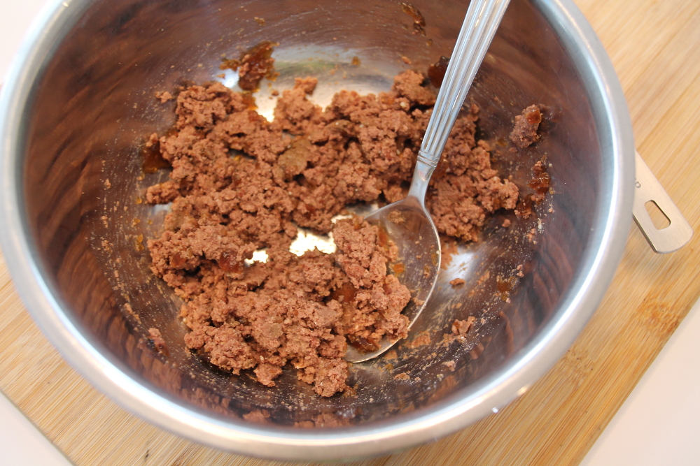 Start by mashing the dog food and then add 1/4 cup of flour. Mix well. Then slowly add another 1/4 cup of flour until the dough starts forming into a ball. I ended up using slightly less than 1/2 cup of flour. The dough will be soft and a little sticky.