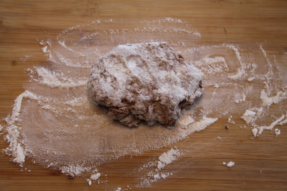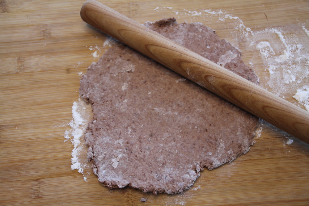 Flour your work surface and lightly knead the dough to form a ball. Roll out the dough with a rolling pin until about 1/4 inch thick. You wont be able to roll this dough really thin as it is really soft and sticky.