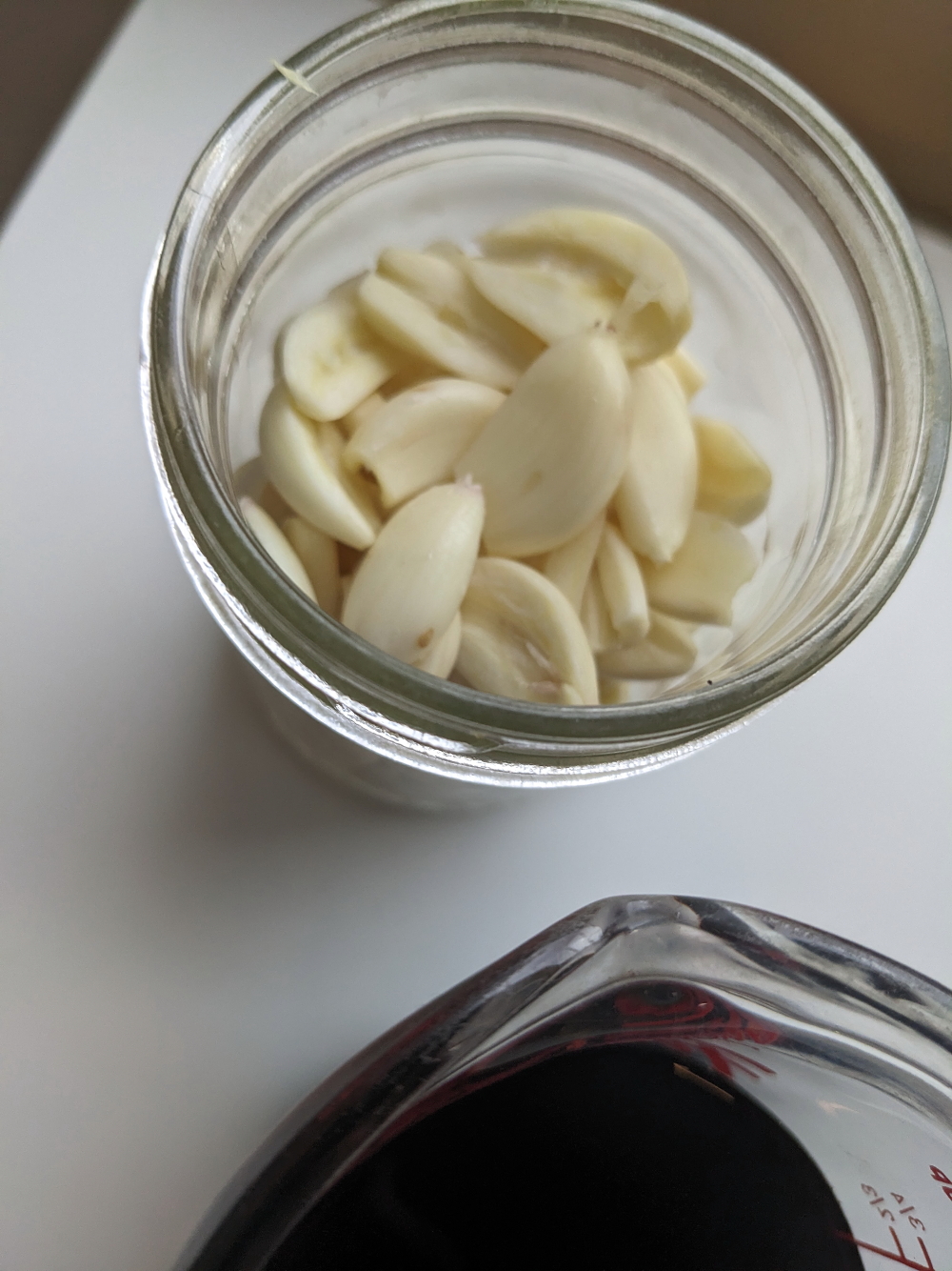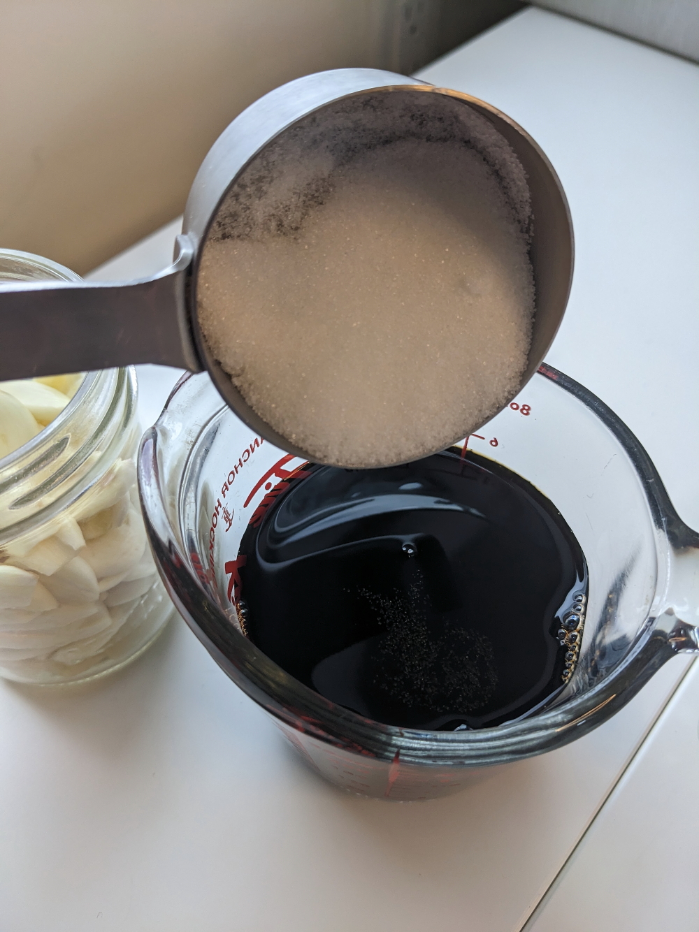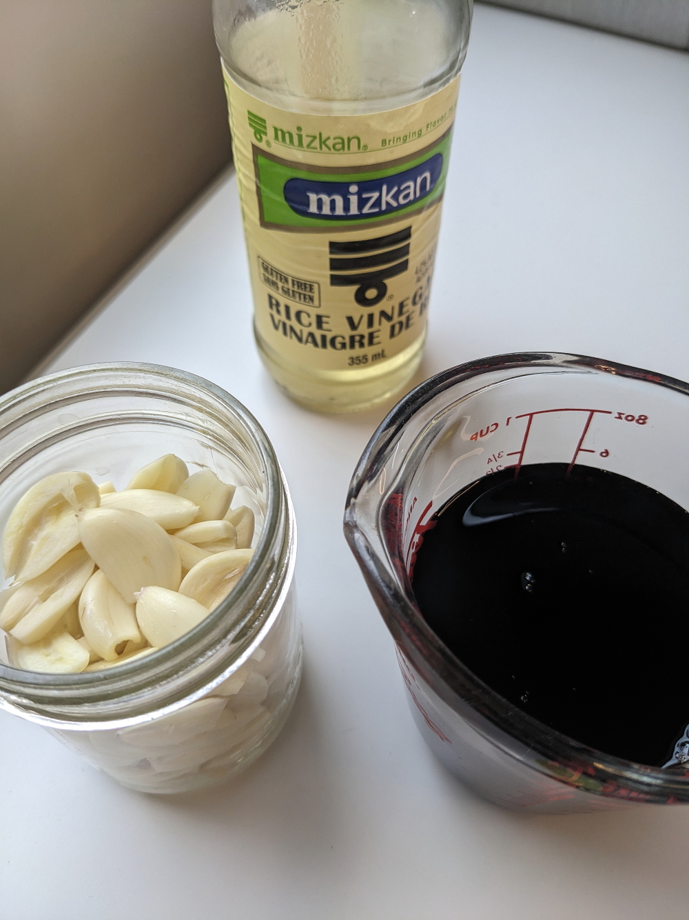 To the garlic, add 1 part vinegar, 1 part sugar and 3 parts soya sauce. (1 cup soya sauce, 1/3 cup vinegar and 1/3 cup sugar.)