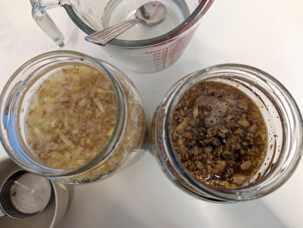 You can see on the right is my ginger beer with coconut sugar. It is a lot darker than the ginger bug on the left.