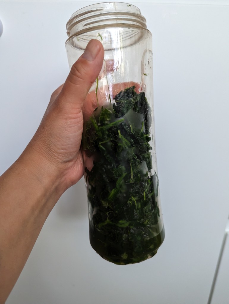 - Allow the frozen spinach (1 cup) to defrost. Place in a blender and add a bit of the oat milk to help puree it. Puree the spinach until is a green slurry.