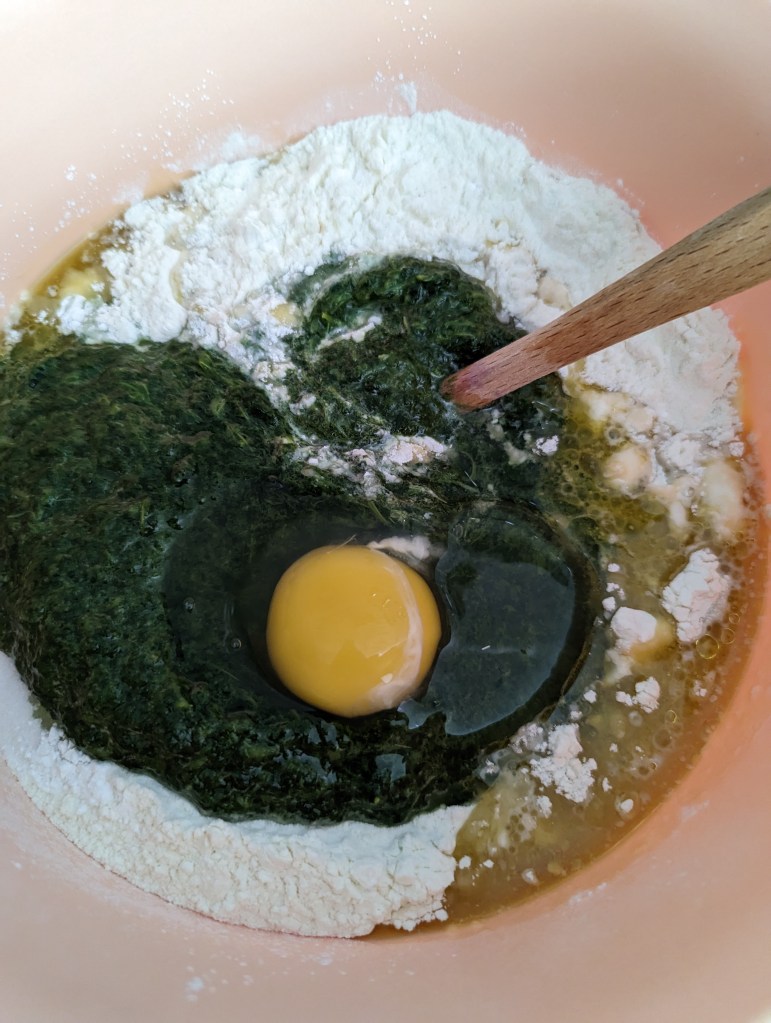 - Into the bowl, add 1 egg and half of the liquid. Mix to combine. Continue to add the liquid until everything is mixed.