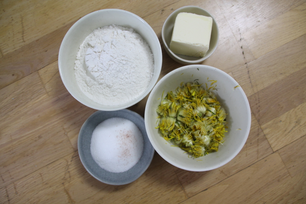 This recipe is just like any shortbread cookie recipe. You need flour, butter and sugar. The dandelion petals add a nice yellow color but the taste is very subtle.