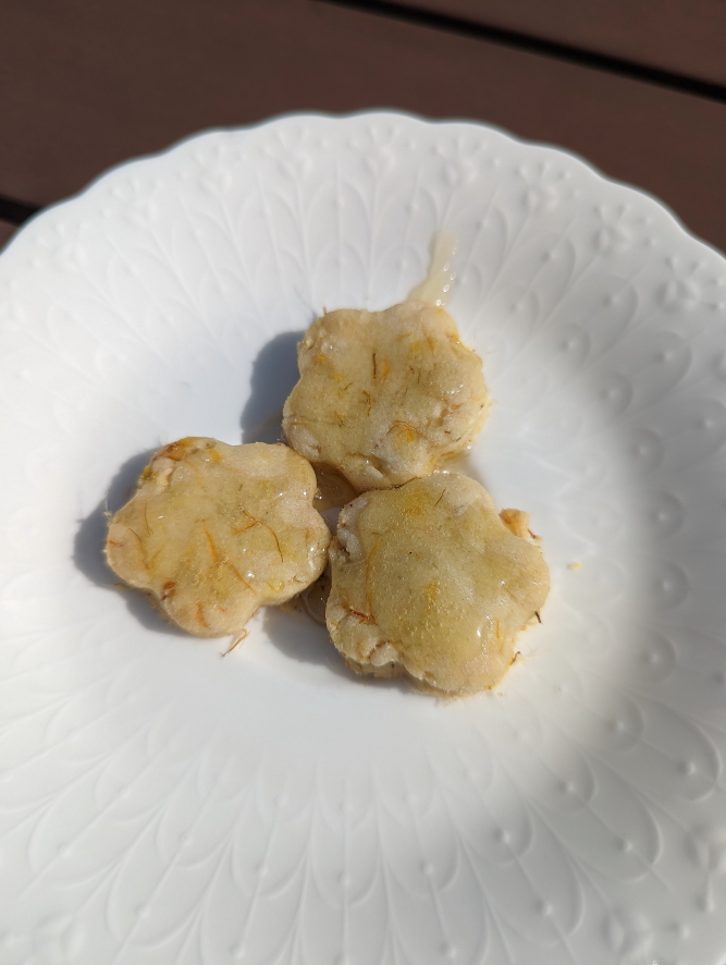 Place the cookies on a baking sheet and bake until light golden brown. You want to keep these cookies light to keep the yellow looking vibrant. I topped these cookies with a drizzle of dandelion honey. They were a tasty snack.