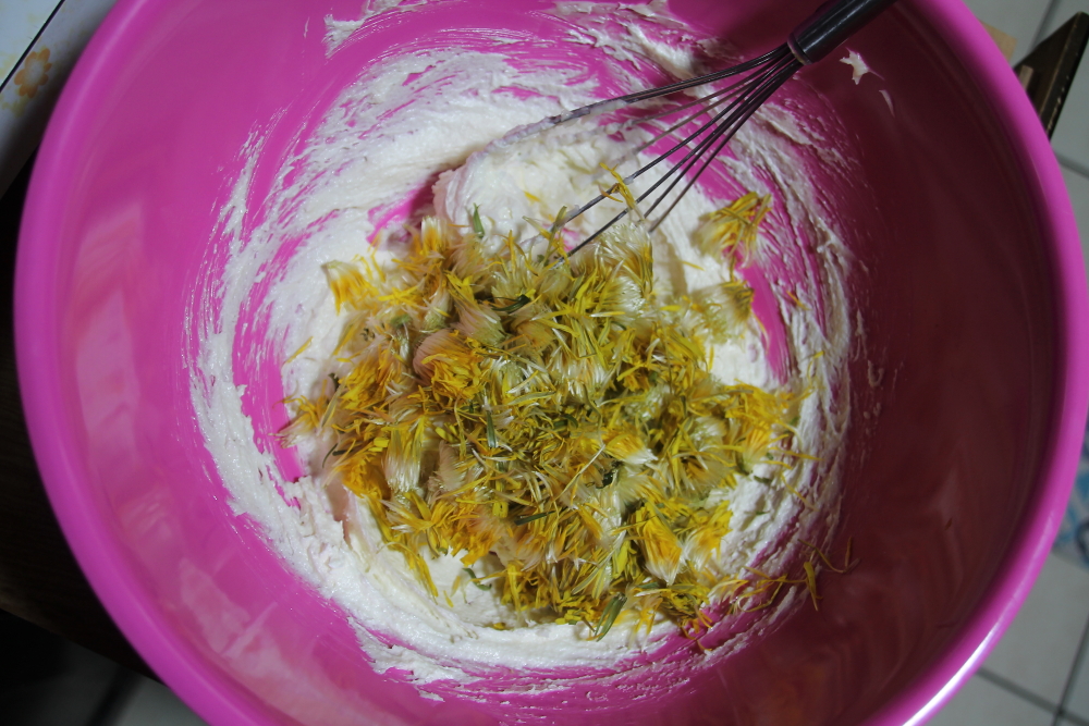 Cream the butter and sugar until blended well. Add the dandelion petals and mix well.