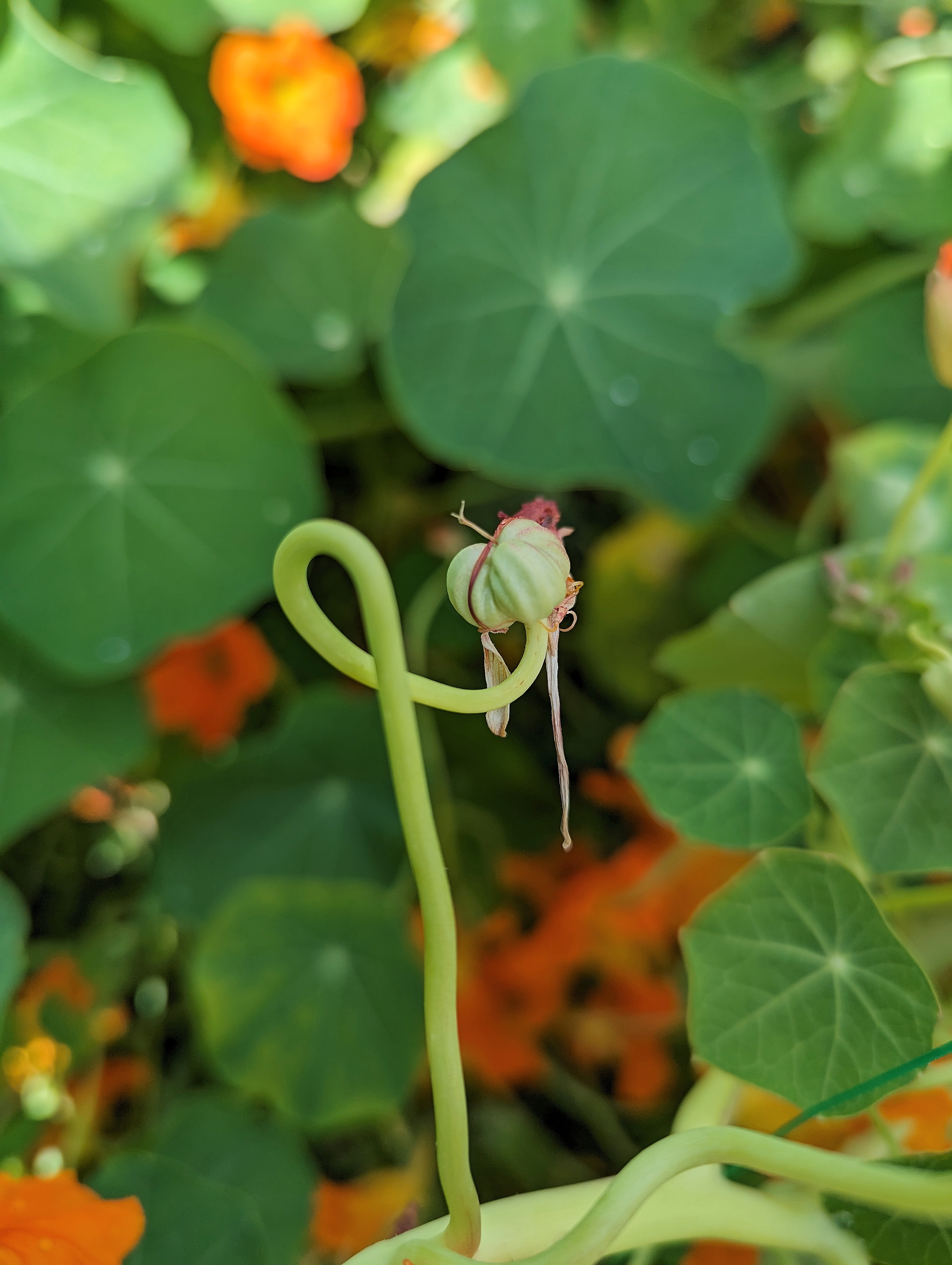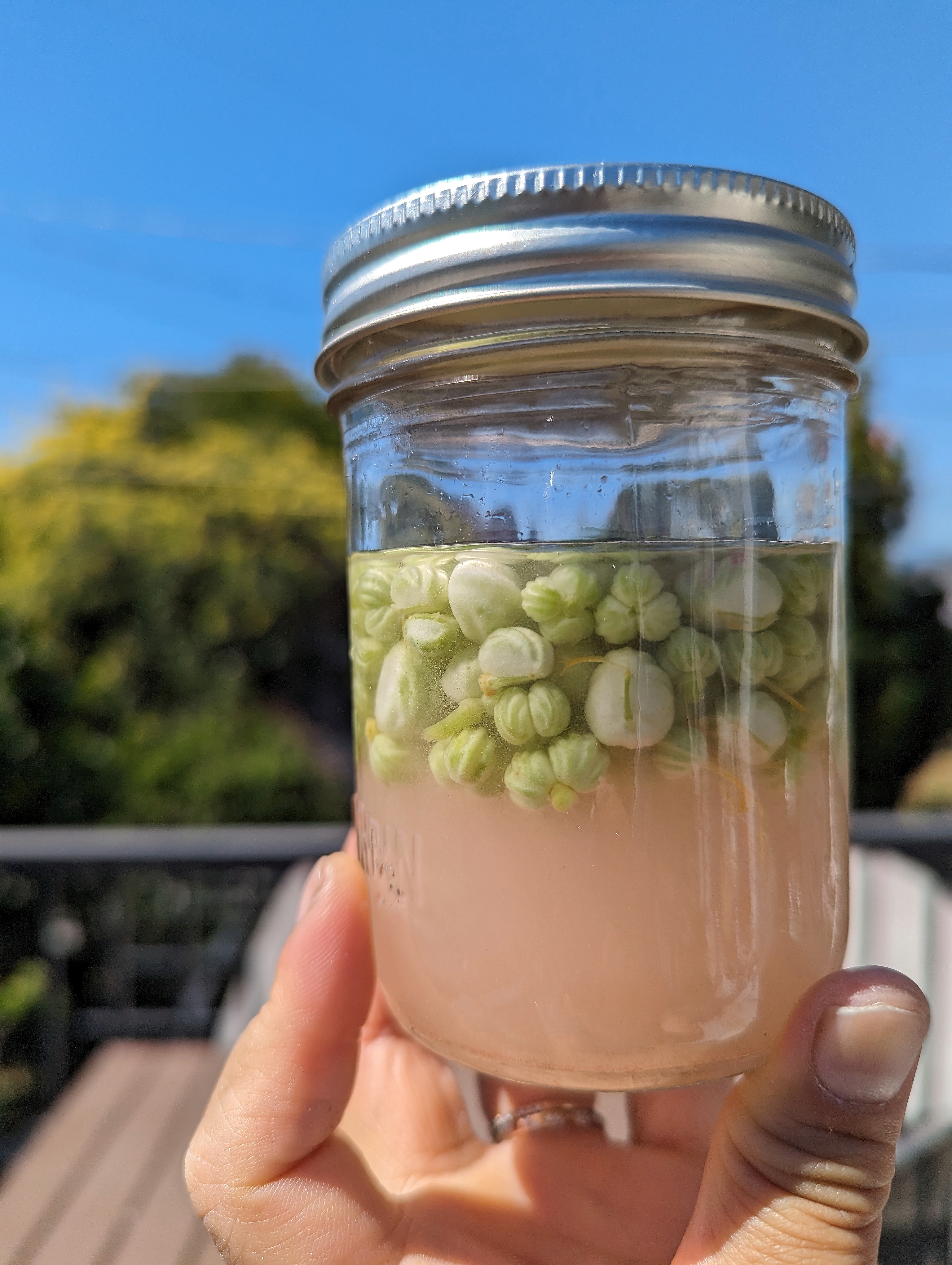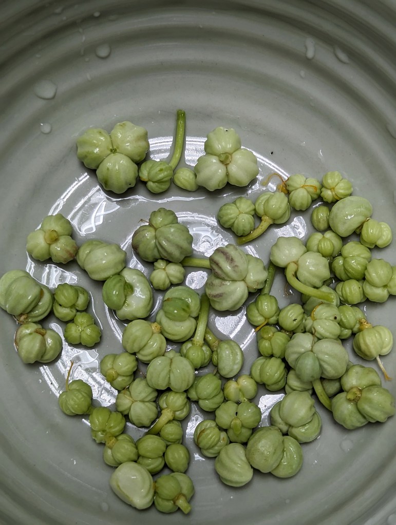 Pick and wash the nasturtium seeds. Separate large seeds and remove stems. Mix together the vinegar, water, salt and sugar and add to a jar with the seeds. Let the seeds pickle for a couple of days. Enjoy with a variety of dishes; salads, sandwiches, and other dishes to add a pickly and spicy bite. Enjoy.