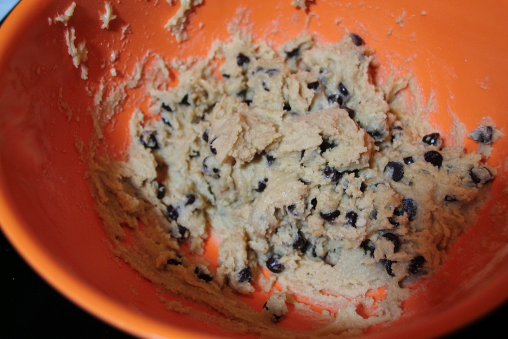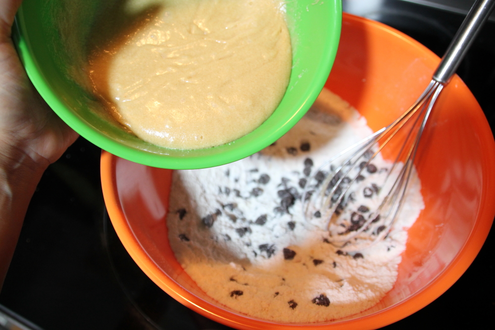 Add this mixture to the dry ingredients: flour, almond flour, baking soda, vanilla and chocolate chips.