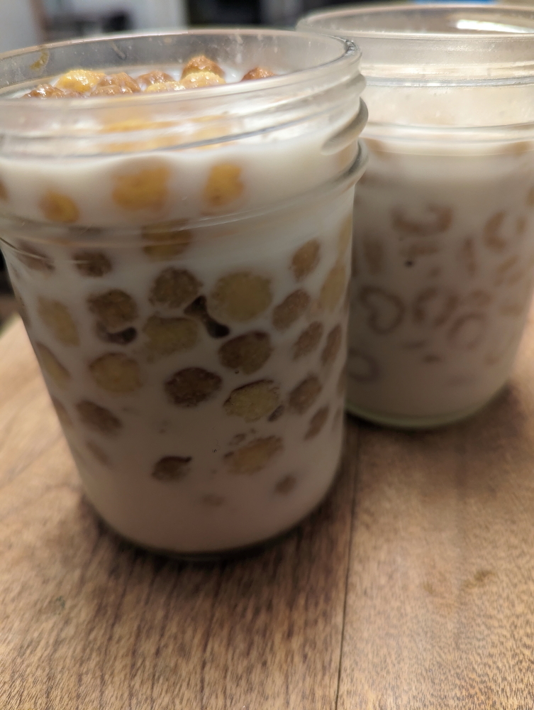 You first need to soak the cereal in milk. I used two half pint jars and filled them with cereal and milk. I let it soak for a couple hours.