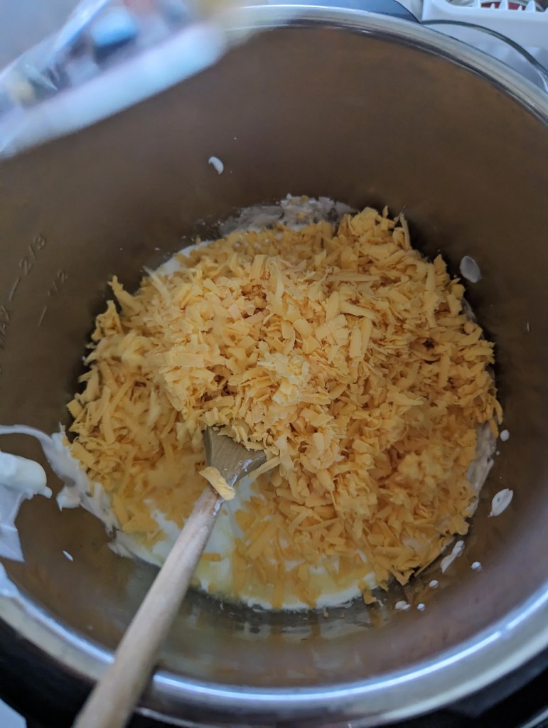 For this recipe, I used an instant pot. I put it in saute mode. It not only is safer for you kids, but you can also make this recipe without a kitchen. In the instant pot, boil the pasta in salted water for about 7-8 minutes. Then drain and set aside. Using the saute mode for the instant pot, pour in the yogurt, cheese and chicken bouillon.