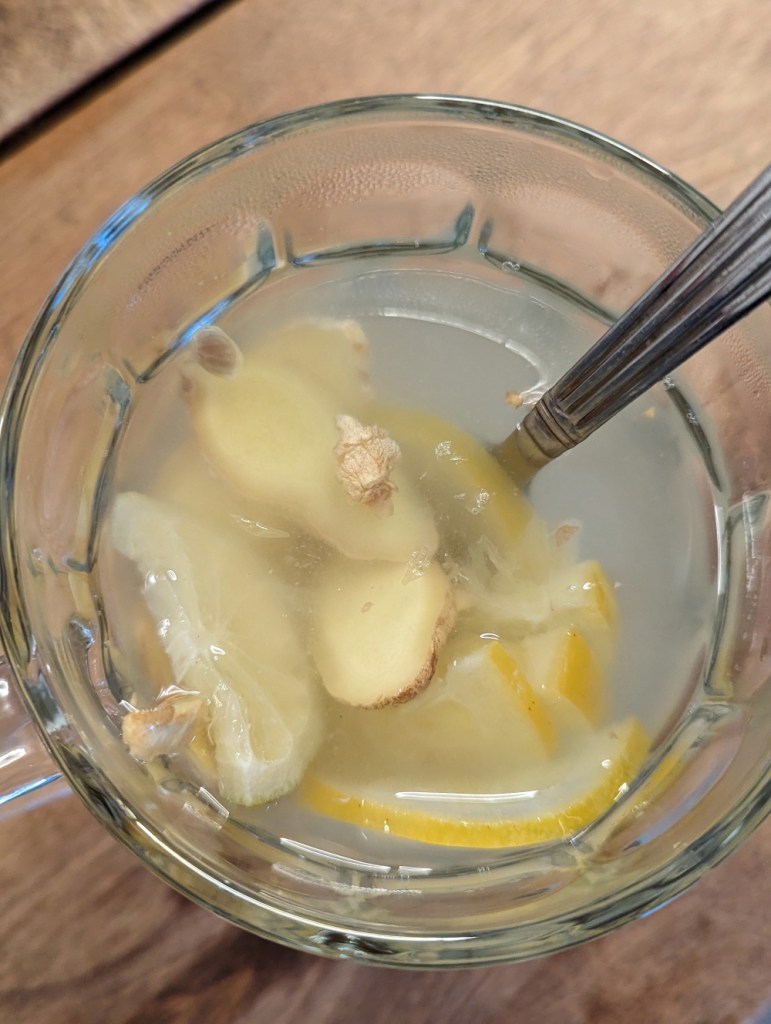 Sterilize your jar in boiling water for about 10 minutes. Wash and clean the ginger and lemon. (try using organic as you will be using the skin.) Slice the lemon and ginger thinly.