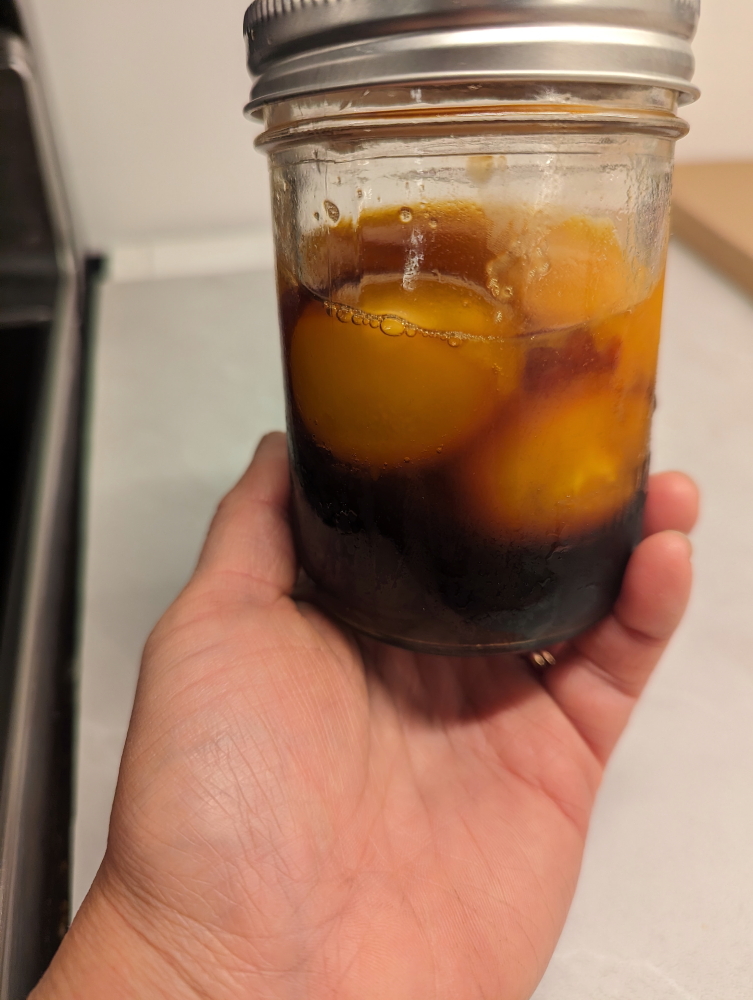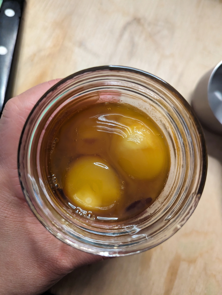 Prepare the soy sauce mixture. I used 1/8 cup Japanese Soup Base and 1/4 cup low sodium soy sauce for 5 egg yolks.