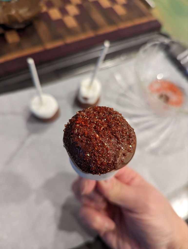 Place the dipped marshmallows on some parchment paper and let them cool. I placed mine in the fridge for a couple minutes to let the chocolate set.