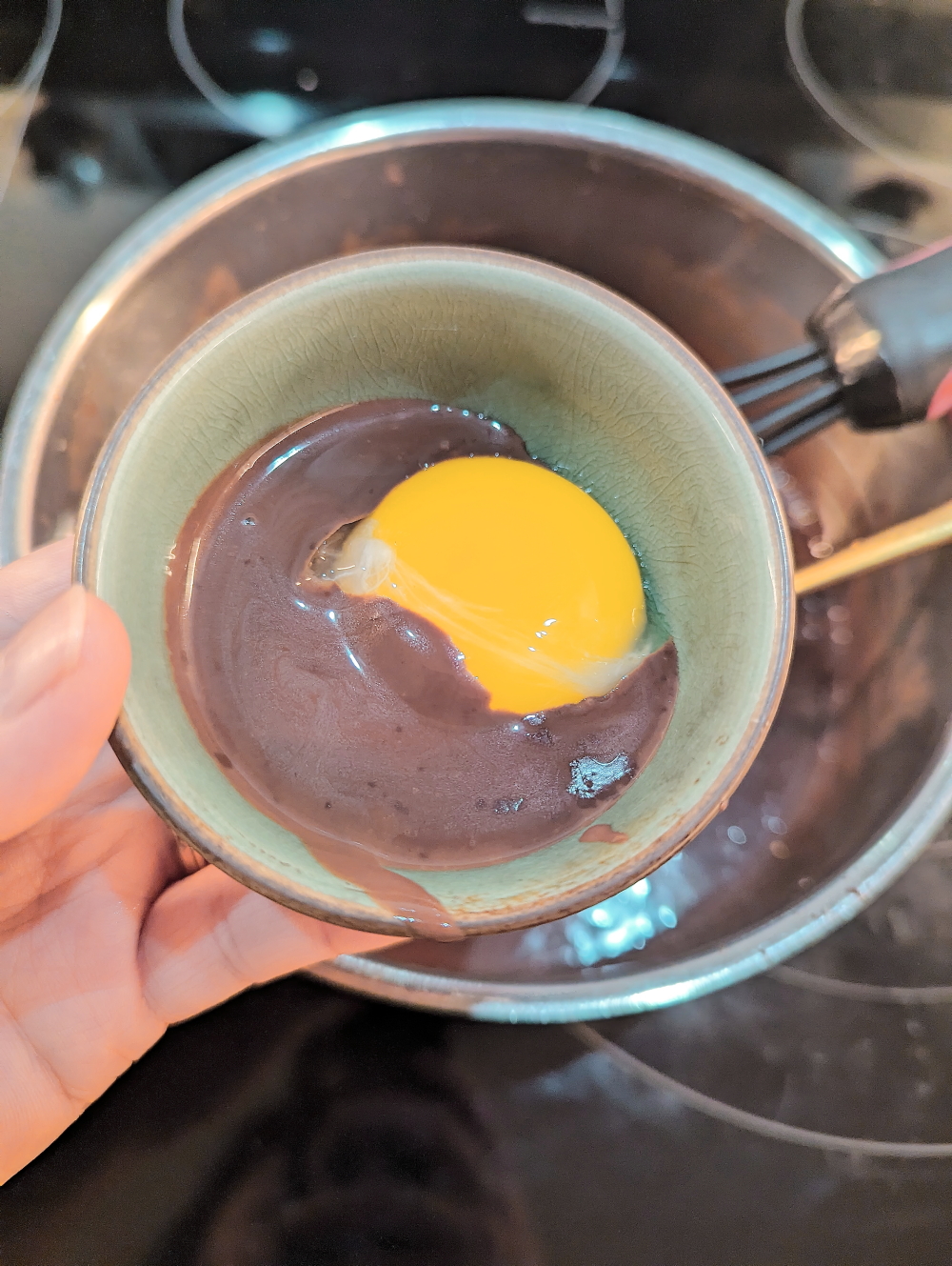 At this point you can add more sugar if the hot chocolate is not sweet enough. Remove the hot chocolate from the heat and temper the egg yolk. You can do this by adding 1-2 tbsp of hot liquid into the egg yolk and mixing. Then pour in the egg yolk mixture into the pot. This prevents the egg yolk from curdling.