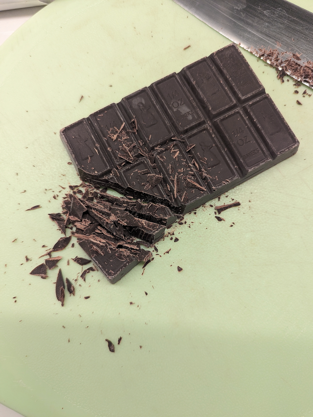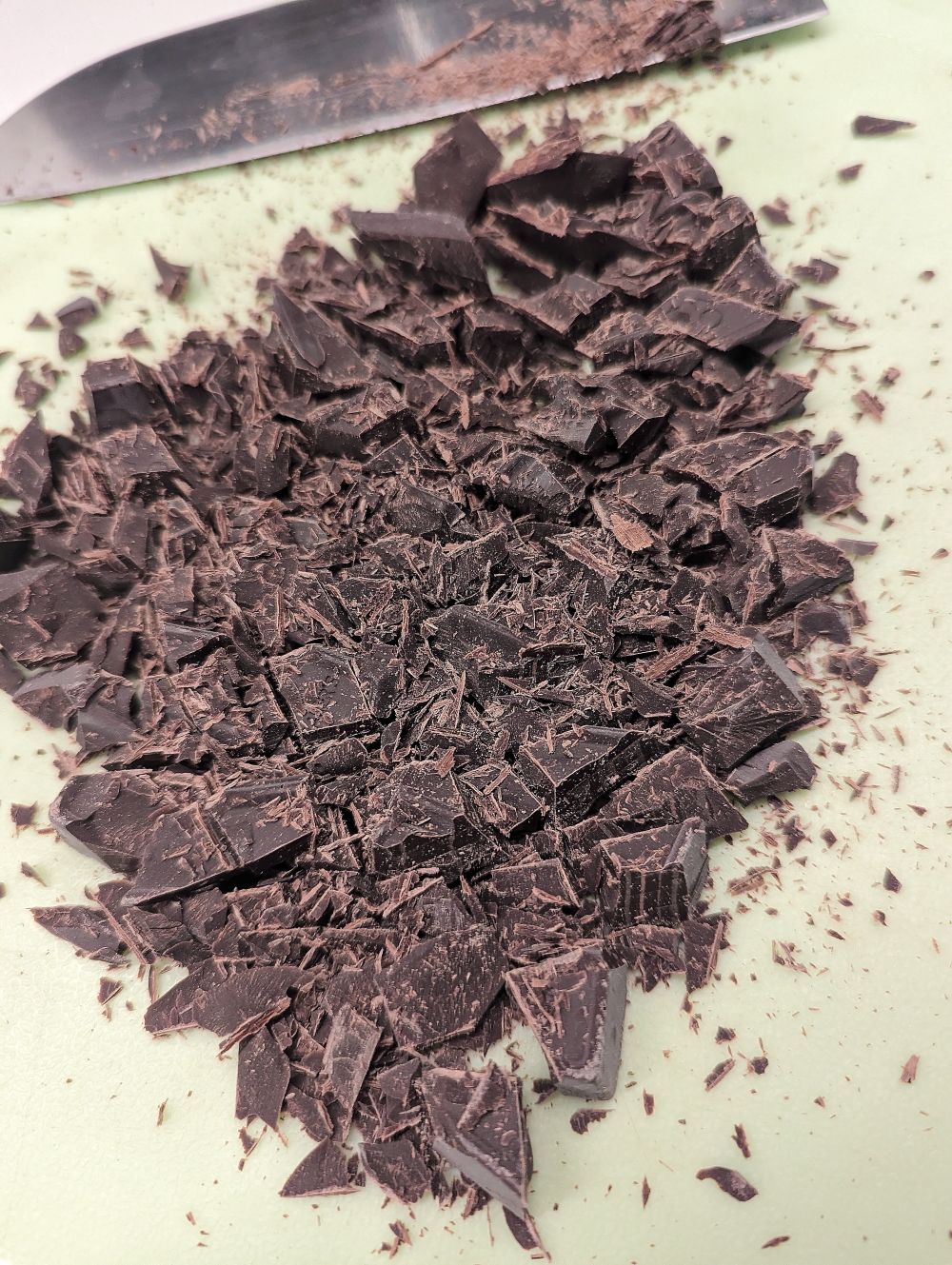 This is a simple recipe. You will need some chocolate. I used dark chocolate because that was in my pantry. Chop the chocolate in tiny pieces.